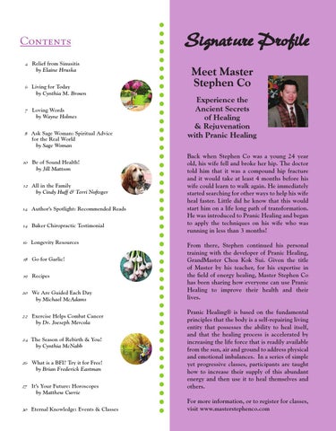 Contents 4 Relief from Sinusitis by Elaine Hruska 6 Living for Today by Cynthia M. Brown 7 Loving Words by Wayne Holmes 8 Ask Sage Woman: Spiritual Advice for the Real World by Sage Woman 10 Be of Sound Health! by Jill Mattson 12 All in the Family by Cindy Huff & Terri Noftsger 14 Author’s Spotlight: Recommended Reads 14 Baker Chiropractic Testimonial 16 Longevity Resources 18 Go for Garlic! 19 Recipes 20 We Are Guided Each Day by Michael McAdams 22 Exercise Helps Combat Cancer by Dr. Joeseph Mercola 24 The Season of Rebirth & You! by Cynthia McNabb 26 What is a BFI? Try it for Free! by Brian Frederick Eastman 27 It’s Your Future: Horoscopes by Matthew Currie 30 Eternal Knowledge: Events & Classes