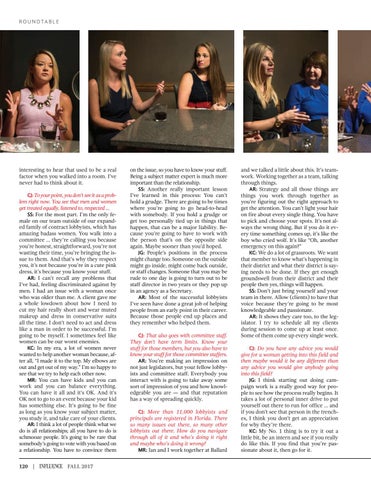 interesting to hear that used to be a real factor when you walked into a room. I’ve never had to think about it. CJ: To your point, you don’t see it as a problem right now. You see that men and women get treated equally, listened to, respected … SS: For the most part. I’m the only female on our team outside of our expanded family of contract lobbyists, which has amazing badass women. You walk into a committee … they’re calling you because you’re honest, straightforward, you’re not wasting their time, you’re bringing the issue to them. And that’s why they respect you, it’s not because you’re in a cute pink dress, it’s because you know your stuff. AR: I can’t recall any problems that I’ve had, feeling discriminated against by men. I had an issue with a woman once who was older than me. A client gave me a whole lowdown about how I need to cut my hair really short and wear muted makeup and dress in conservative suits all the time. I don’t need to act and dress like a man in order to be successful. I’m going to be myself. I sometimes feel like women can be our worst enemies. KC: In my era, a lot of women never wanted to help another woman because, after all, “I made it to the top. My elbows are out and get out of my way.” I’m so happy to see that we try to help each other now. MR: You can have kids and you can work and you can balance everything. You can have it all and it’s OK. And it’s OK not to go to an event because your kid has something else. It’s going to be fine as long as you know your subject matter, you study it, and take care of your clients. AR: I think a lot of people think what we do is all relationships; all you have to do is schmooze people. It’s going to be rare that somebody’s going to vote with you based on a relationship. You have to convince them 120 | INFLUENCE FALL 2017