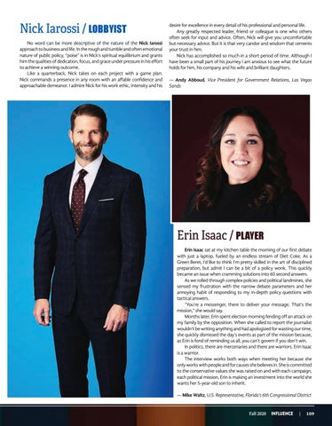 Erin Isaac / PLAYER Erin Isaac sat at my kitchen table the morning of our first debate with just a laptop, fueled by an endless stream of Diet Coke. As a Green Beret, I’d like to think I‘m pretty skilled in the art of disciplined preparation, but admit I can be a bit of a policy wonk. This quickly became an issue when cramming solutions into 60 second answers. As we rolled through complex policies and political landmines, she sensed my frustration with the narrow debate parameters and her annoying habit of responding to my in-depth policy questions with tactical answers. “You’re a messenger, there to deliver your message. That’s the mission,” she would say. Months later, Erin spent election morning fending off an attack on my family by the opposition. When she called to report the journalist wouldn’t be writing anything and had apologized for wasting our time, she quickly dismissed the day’s events as part of the mission because, as Erin is fond of reminding us all, you can’t govern if you don’t win. In politics, there are mercenaries and there are warriors. Erin Isaac is a warrior. The interview works both ways when meeting her because she only works with people and for causes she believes in. She is committed to the conservative values she was raised on and with each campaign, each political mission, Erin is making an investment into the world she wants her 5-year-old son to inherit. — Mike Waltz, U.S. Representative, Florida’s 6th Congressional District