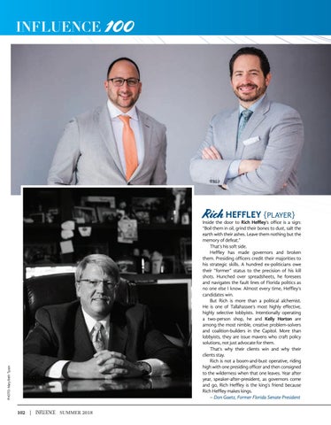 Inside the door to Rich Heffley’s office is a sign: “Boil them in oil, grind their bones to dust, salt the earth with their ashes. Leave them nothing but the memory of defeat.” That’s his soft side. Heffley has made governors and broken them. Presiding officers credit their majorities to his strategic skills. A hundred ex-politicians owe their “former” status to the precision of his kill shots. Hunched over spreadsheets, he foresees and navigates the fault lines of Florida politics as no one else I know. Almost every time, Heffley’s candidates win. But Rich is more than a political alchemist. He is one of Tallahassee’s most highly effective, highly selective lobbyists. Intentionally operating a two-person shop, he and Kelly Horton are among the most nimble, creative problem-solvers and coalition-builders in the Capitol. More than lobbyists, they are issue mavens who craft policy solutions, not just advocate for them. That’s why their clients win and why their clients stay. Rich is not a boom-and-bust operative, riding high with one presiding officer and then consigned to the wilderness when that one leaves. Year after year, speaker-after-president, as governors come and go, Rich Heffley is the king’s friend because Rich Heffley makes kings. – Don Gaetz, Former Florida Senate President 102 | INFLUENCE SUMMER 2018