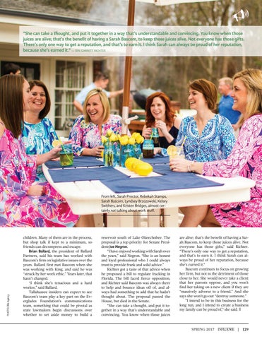children. Many of them are in the process, but shop talk if kept to a minimum, so friends can decompress and escape. Brian Ballard, the president of Ballard Partners, said his team has worked with Bascom’s firm on legislative issues over the years. Ballard first met Bascom when she was working with King, and said he was “struck by her work ethic.” Years later, that hasn’t changed. “I think she’s tenacious and a hard worker,” said Ballard. Tallahassee insiders can expect to see Bascom’s team play a key part on the Everglades Foundation’s communications team, something that could be pivotal as state lawmakers begin discussions over whether to set aside money to build a