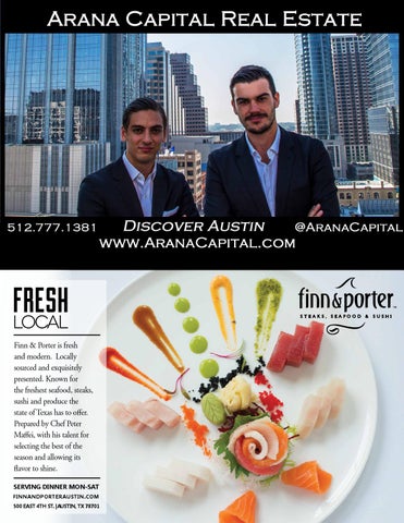 FRESH LOCAL Finn & Porter is fresh and modern. Locally sourced and exquisitely presented. Known for the freshest seafood, steaks, sushi and produce the state of Texas has to offer. Prepared by Chef Peter Maffei, with his talent for selecting the best of the season and allowing its flavor to shine. SERVING DINNER MON-SAT FINNANDPORTERAUSTIN.COM 500 EAST 4TH ST. | AUSTIN, TX 78701