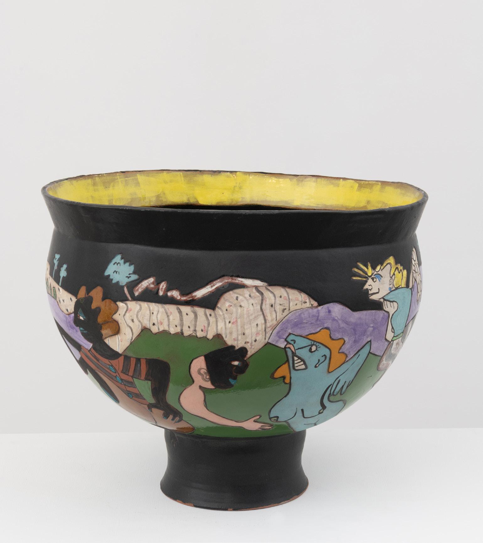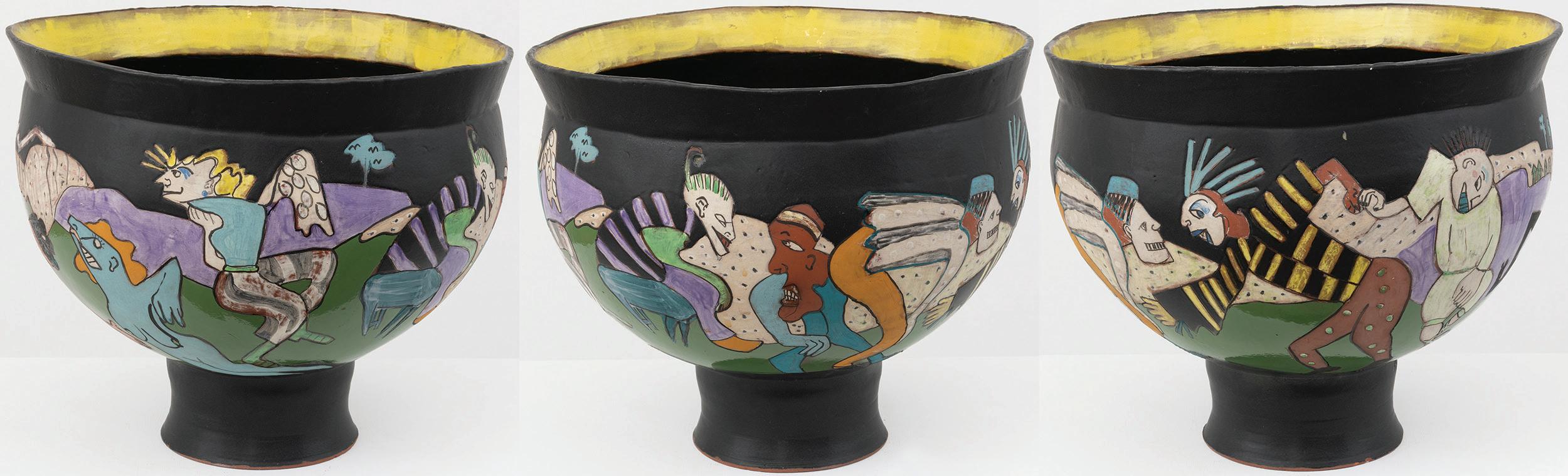 Billops transfers her colorful, expressive, almost caricaturish paintings of people interacting in a noneuclidean space onto the surface of a large black ceramic bowl of her creation, Title Unknown. This unique painting resembles a reel, with no beginning and no end, no left or right side. Inspired by African art and its aesthetics of color, Billops paints in a playful, almost childlike manner, similar to Matisse and Picasso. With a pastel palette and in her raw and distinct style, Billops paints figures of black and white people interacting in an outdoor context of land and occasional trees, surrounded by a black background, the bowl. Billops illustrates loosely drawn forms with black contours colored in flat washes of paint on its surface. The brushstrokes are visible, and the shapes are arranged like puzzle pieces. Although the foreground and background seem to merge as one flat surface of colored shapes, this image has depth. As evident in her depictions of the small trees and houses, Billops uses scale to create, distance, and depict the vastness of land. The contrast between the background and foreground colors brings light to the images. She creates a boundary between the interior and exterior of the bowl with yellow brush strokes along its inner rim. Thus, producing a dance between light and dark, balancing the composition and its colors.