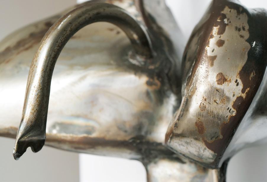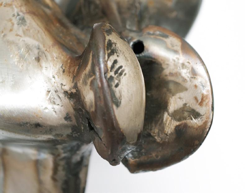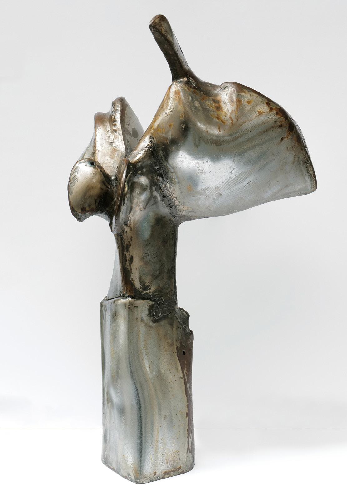 Richard Hunt's sculptures are renowned for their fine balance of delicate, outstretched scions, often welded to a dense, angular base. Many of Hunt's works contain parts derived from automobiles and assorted industrial elements; which imbue his compositions with a blend of organic and mechanical references; comprising triumphant shapes in space, finished with premier welding. Hunt's attention to fine art, material and texture is exemplified in Winged Hybrid (1973), a phenomenal work of sculptural genius assembled from automobile parts and welded into a luminous, curving silhouette. Produced fifty years ago, this museum-caliber work is a profound example of Hunt's insightful craftsmanship. From the smooth shine of light glinting off the edge of steel to the captivating gradation of color on chrome, Hunt's brilliance with regard to compositional balance with wrought metals remains unparalleled. Luminous from all angles, Winged Hybrid is a profound instance of sculptural virtuosity.