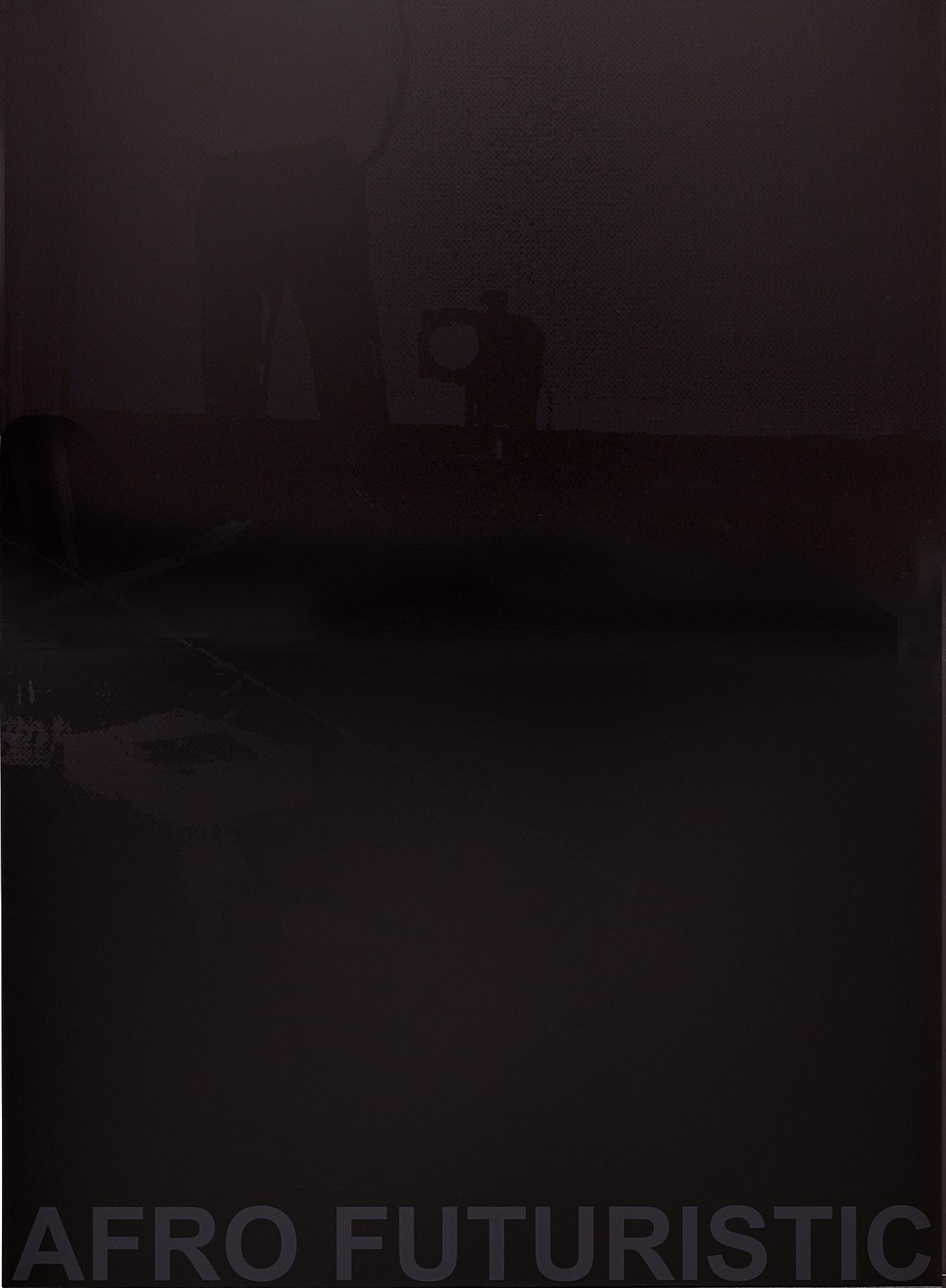 Receiving his first solo exhibition at MoMA in 2022 including his works in paintings, drawings, textile works, sculptures, moving images, and a sound piece, Adam Pendleton showcased his academic importance, tightly connected to Black Dada, which has underpinned his work for more than a decade showing his exploration between theories of Blackness and abstraction/ avant-garde. Afro-Futuristic presents Pendleton’s early studies on the subject of both the history of and the contemporary themes within Black America. Minimalistic with large text stating “AFRO FUTURISTIC” expanding in dark grey bold lettering across a tinted image of what appears to be an imposed photograph of the legs of a person standing adjacent to studio spotlight on one side and a chair resting above a chalky “x” spot mark. Though minimalistic, Adam Pendleton manages to take the viewer back to a day when black exploitation films in America were popular; displaying a time when films with names like “afro futuristic” would have flashed across the T.V screen of many Black American families.