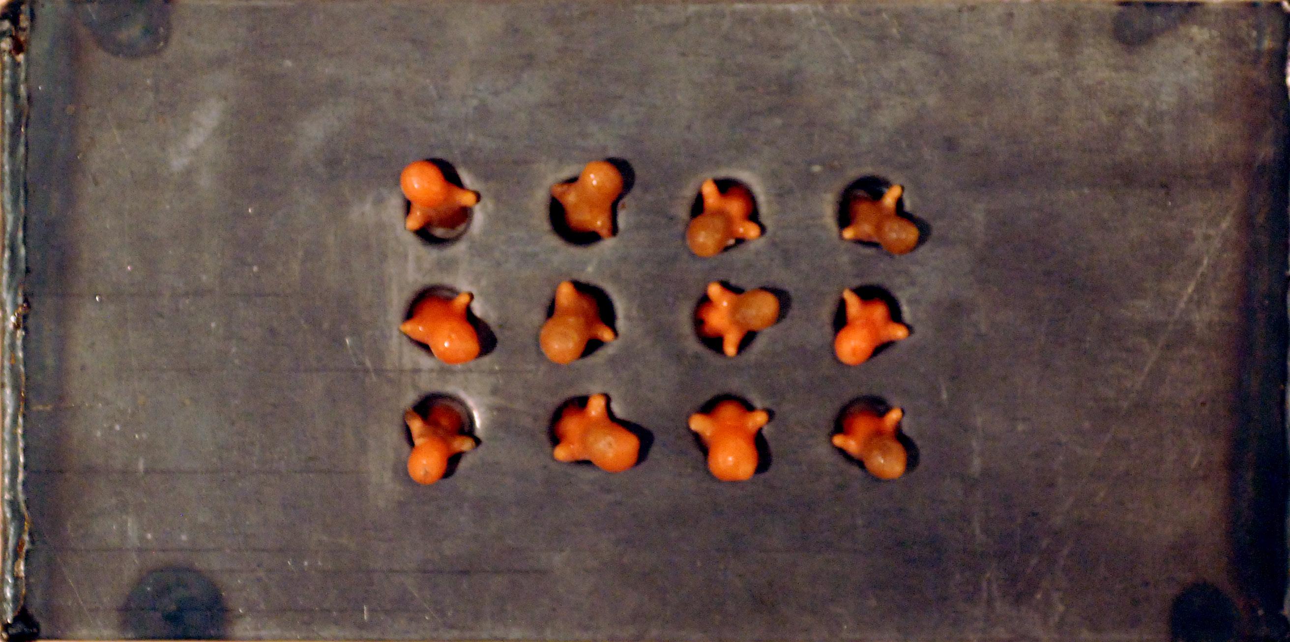 Intrusion by Jo Ann Jones shows the similar metal rectangular block with indents on top. In Intrusion, the smooth and perfect circular spaces on the top surface is deconstructed into organic shaped indents created with forceful breaks. The edges appear rough, the sizes vary, and the spacing of each location is more random without a spatial arrangement but still gathered towards the center. The peaceful distributed of the wax figures are distorted as well. None of the figure has their head facing up, but rather most of them is upside down with their feet above the clear wax facing up. There are two instances where inside one space, there is no clear sign of any wax figure inside and in the other space, there is only a small piece that cannot indicate any particular body parts. The space and situation is transformed from the peaceful to the distorted, however, the figures still exists, posing some extent of hope.