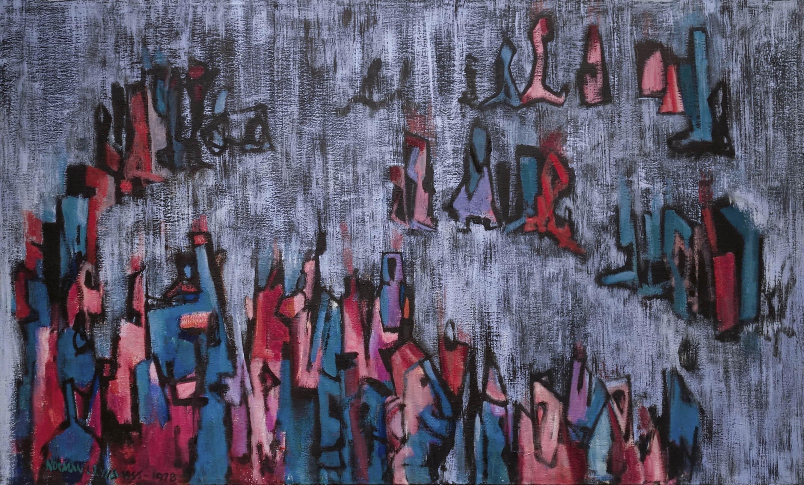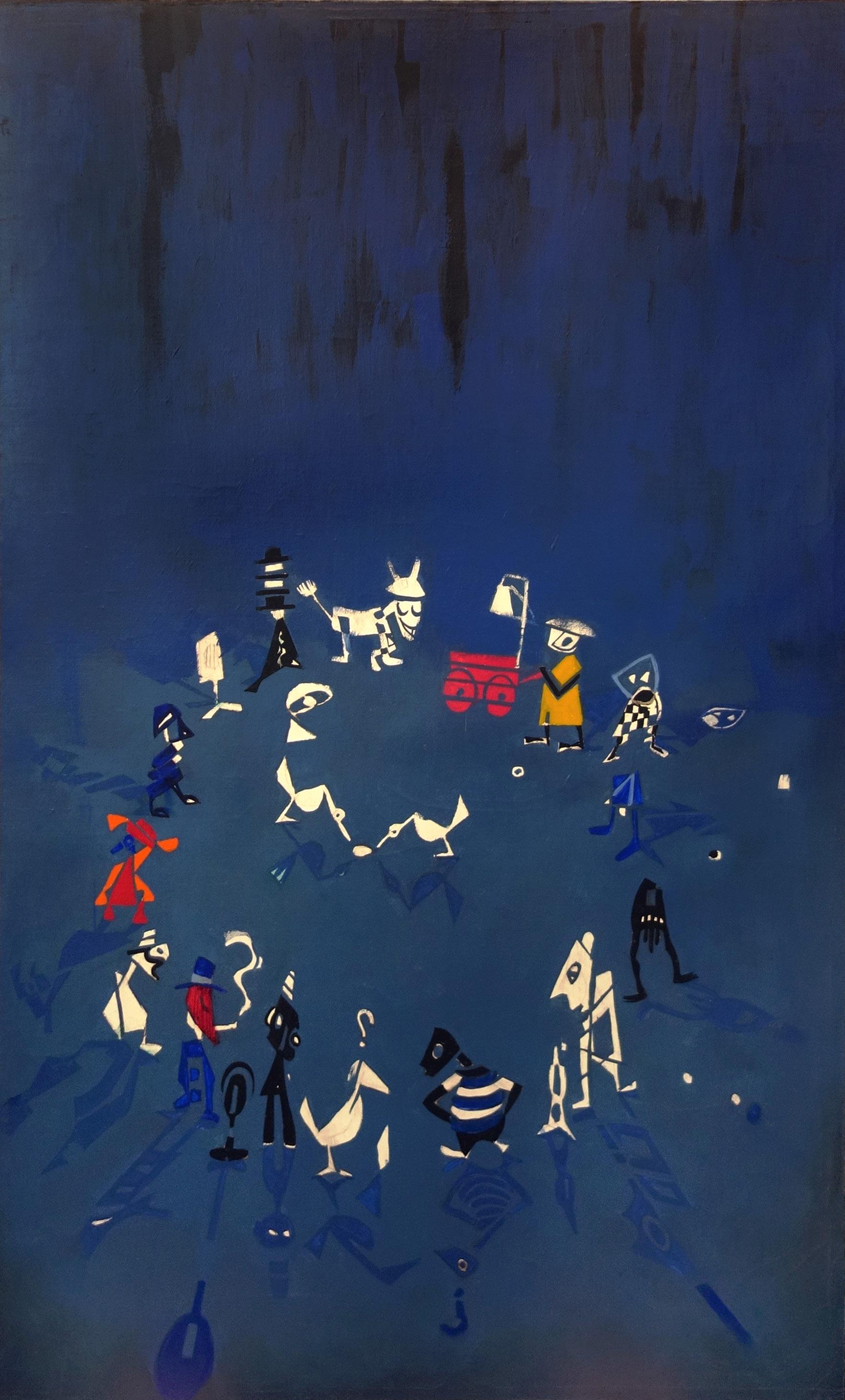 Games, painted in 1965 by Norman Lewis, presents a captivating oil artwork that captures a gathering of abstract figures encircling against a backdrop of deep blue. Within this composition, the figures comprise not only individuals but also animals and assorted creatures, and their forms are distilled into geometric elegance. Facial and bodily characteristics are selectively accentuated or omitted, resulting in a unique harmony. Amidst these figures emerges a poised man donning a blue hat and suit, his demeanor serene as he indulges in a contemplative cigarette. Adjacently, a white figure—perhaps a dog—exudes jubilant emotion, its laughter symbolically echoed through its open mouth. A deliberate luminance adorns the painting’s center, ingeniously drawing our gaze toward the heart of the scene, while each figure’s presence casts graceful shadows. Delving into the artwork, the figures’ physical structures evoke a profound kinship with the symbols, letters, and motifs found in African art. Remarkably, African artistic influences stand as a linchpin in Lewis’s creative evolution, gifting him not only cultural insights but also novel perspectives on the essence of artistic expression.