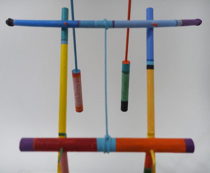 Duet: Past and Future, this delicate and colorful kinetic sculpture is a strong example of Scott’s painted kinetic metal works. Its seemingly simple, yet complex, slender forms are inspired by the “diddley bow”, a string instrument from West African culture,1 and balanced by physics. These kinetic sculptures served as the basis for his large-scale public commissions, including “Spirit Gates” at the New Orleans Museum of Art and “River Spirit” at Woldenberg Park in New Orleans.¹