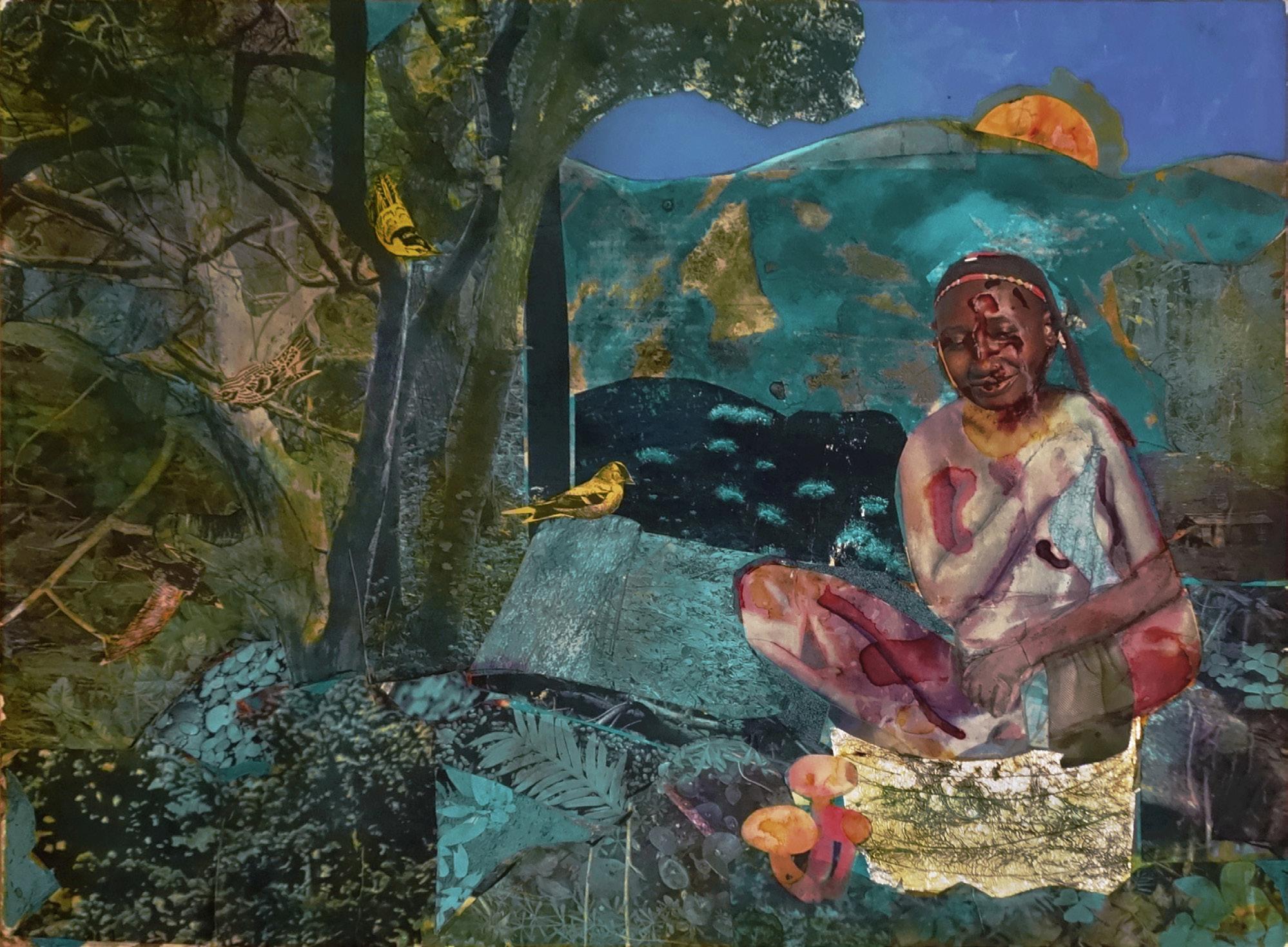 Sunset, a collage of verdant greens, delicately accented by the magenta hues of a figure cradled in foliage abound. Though shape and shadow are bisected and sourced from the saturated dyes of cuttings and photographs, the composition of Sunset is imbued with a dreamy gentleness that an impressionist scene of idyllic nature might invoke. The feminine figure in the foreground, whose shades of orange share a color palette only with the setting sun, is the portrait of interior serenity. Donning a beaded headband with eyes not quite closed, the corners of her mouth curve into a gentle smile. Bearden, a tour de force of the mixed media and collage genre, beckons viewers to consider how a spirit of tranquility can be inscribed within pressed layers of paper on fiberboard. Created at the height of the artist’s collage works, Bearden’s Sunset is the pinnacle of craft and detail, illustrative of an artist’s keen sensibility of surreal place and personhood that a work can evoke.