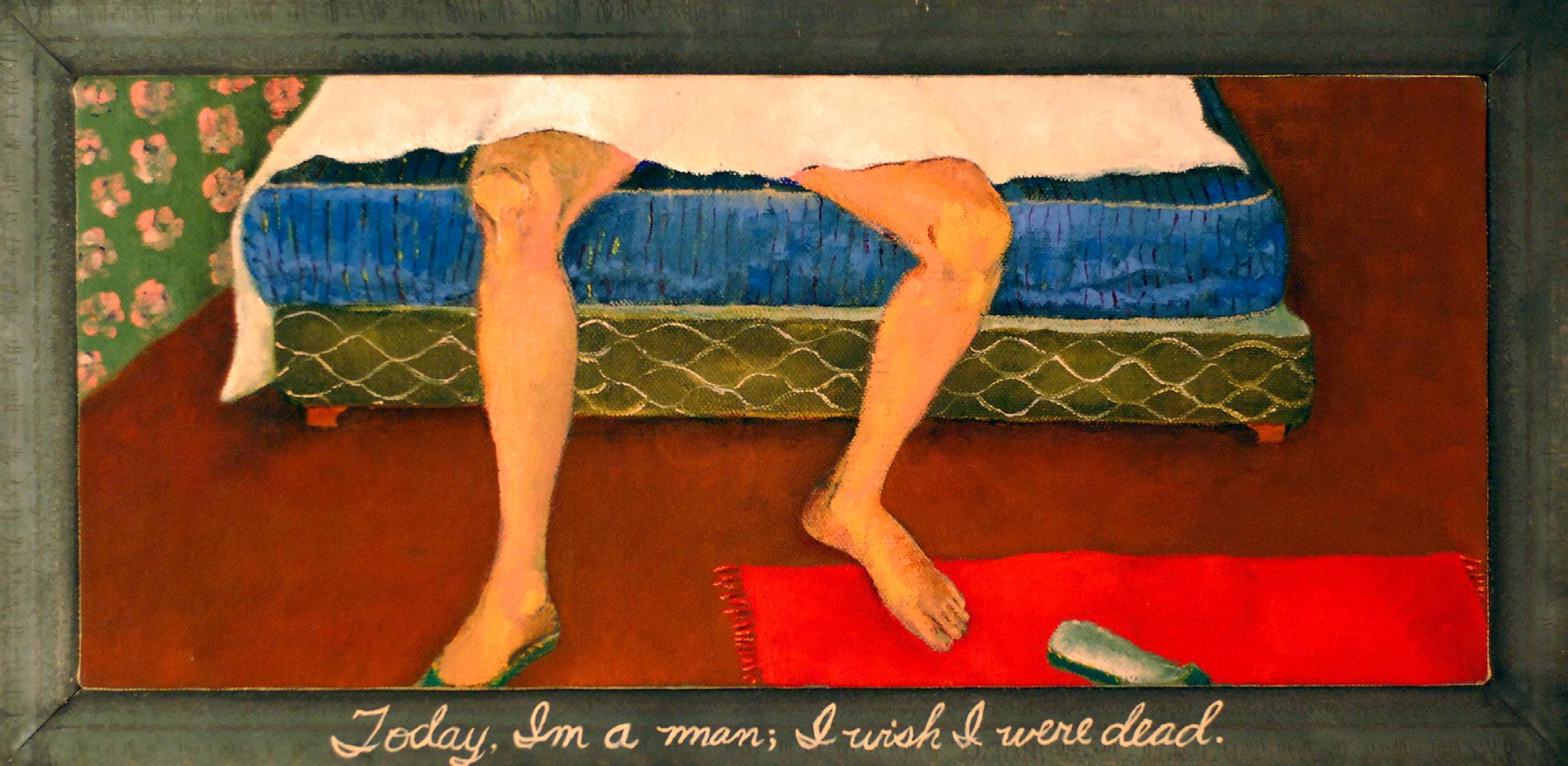 Sitting at the edge of a bed with two bare legs holding out from a white blanket or a huge dress or skirt, Today, I’m a man; I wish I were dead, (1995) captures the lower half body of an unidentified figure. The canvas is saturated with colors indicating the environment. The floor is red; the bed frame is olive green; the wall is decorated with green and pink floral patterns; and the mattress is blue. As suggested by the title, the anonymous figure is a female, potentially at a depressing moment in her life. She wears a pair of green flats, while her left shoe is fallen off. The narrative of the painting is incomplete and raises many questions for its viewers. Under the depressing titles, questions over the emotional state of the figure raise strong concerns, especially true when the painting intentionally cuts off facial features. Furthermore, the depiction of the bed scene also creates an ambiguous intimate sphere, with the bold color contrast between the white blanket, which also employs the meaning of purity and cleanness, and the dark red floor and the bright red carpet on the floor. Mysteris remains in the painting.