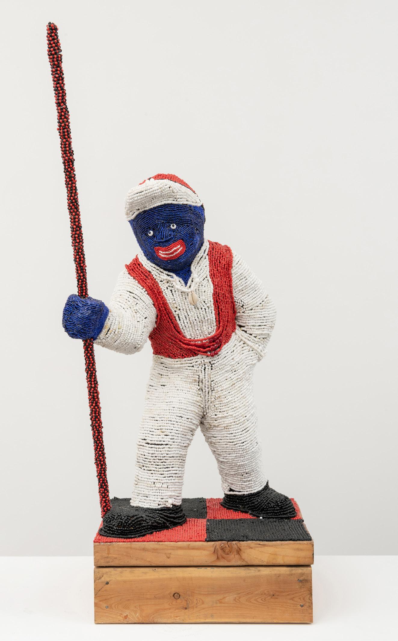 Are-rendering of a Black lawn jockey statue whose title, Elegba (pp. 25-27), refers to a Yoruba deity and is a fascinating example of the artist’s thematic interest in capturing Africanist and African American canonical symbolism in contemporary art. Black lawn jockey statues were used during the Civil War to provide directional signals to runaway slaves as they journeyed toward the Canadian border. Due to its innocuous appearance that capitalizes on the servile archetype of Sambo figurines, the Black lawn jockey was a subversive tool for the Underground Railroad. Cole uses cowrie shells to adorn the figure’s beaded vestments. Interestingly, cowrie shells symbolize wealth, fertility, and protection when traveling across stormy waters. In this work, Cole masterfully uses medium and symbolism to produce a sculpture that engages with the complex history of the Transatlantic Slave Trade.