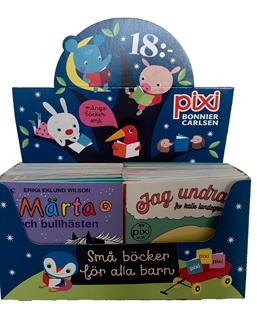 Perfekt till barnkalaset eller att ta med på resan! Åtta nya fantastiska bilderböcker till ett lika fantastiskt pris. Varje kartong innehåller 48 böcker av åtta olika titlar för barn mellan 2–6 år. I över 60 år har Pixiböckerna funnits, och mer än 65 miljoner exemplar har sålts.