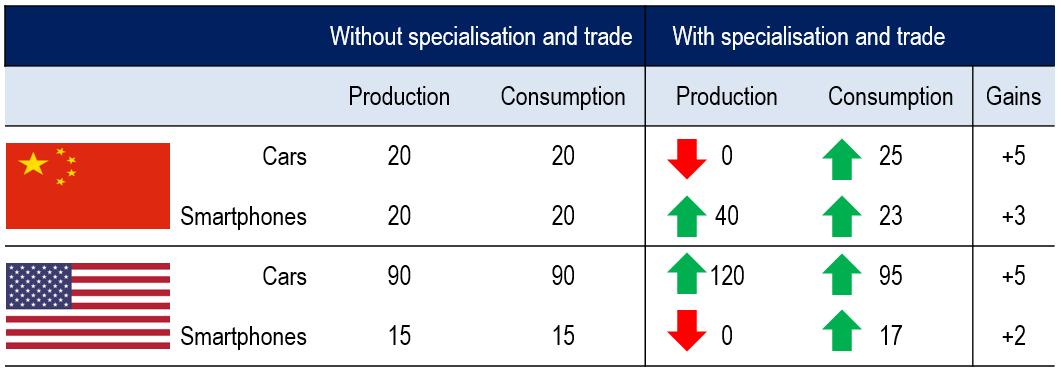 At a national scale, this ability for firms to specialise and trade means that economies have focussed on producing goods and services where they have a comparative strength. These are then traded with other countries to generate the income to purchase and import from elsewhere those goods and services that are demanded domestically but would be relatively difficult or costly to produce locally. In this way, productive capacity is increased in nations on either side of the trades, so levels of consumption (and prosperity) can also be higher; it’s a win-win. (See Figure 2.)