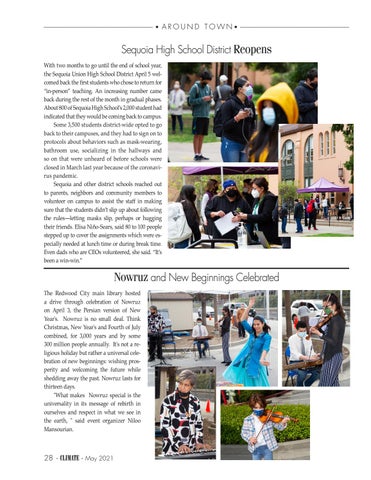 Sequoia High School District Reopens With two months to go until the end of school year, the Sequoia Union High School District April 5 welcomed back the first students who chose to return for “in-person” teaching. An increasing number came back during the rest of the month in gradual phases. About 800 of Sequoia High School’s 2,000 student had indicated that they would be coming back to campus. Some 3,500 students district-wide opted to go back to their campuses, and they had to sign on to protocols about behaviors such as mask-wearing, bathroom use, socializing in the hallways and so on that were unheard of before schools were closed in March last year because of the coronavirus pandemic. Sequoia and other district schools reached out to parents, neighbors and community members to volunteer on campus to assist the staff in making sure that the students didn’t slip up about following the rules—letting masks slip, perhaps or hugging their friends. Elisa Niño-Sears, said 80 to 100 people stepped up to cover the assignments which were especially needed at lunch time or during break time. Even dads who are CEOs volunteered, she said. “It’s been a win-win.”