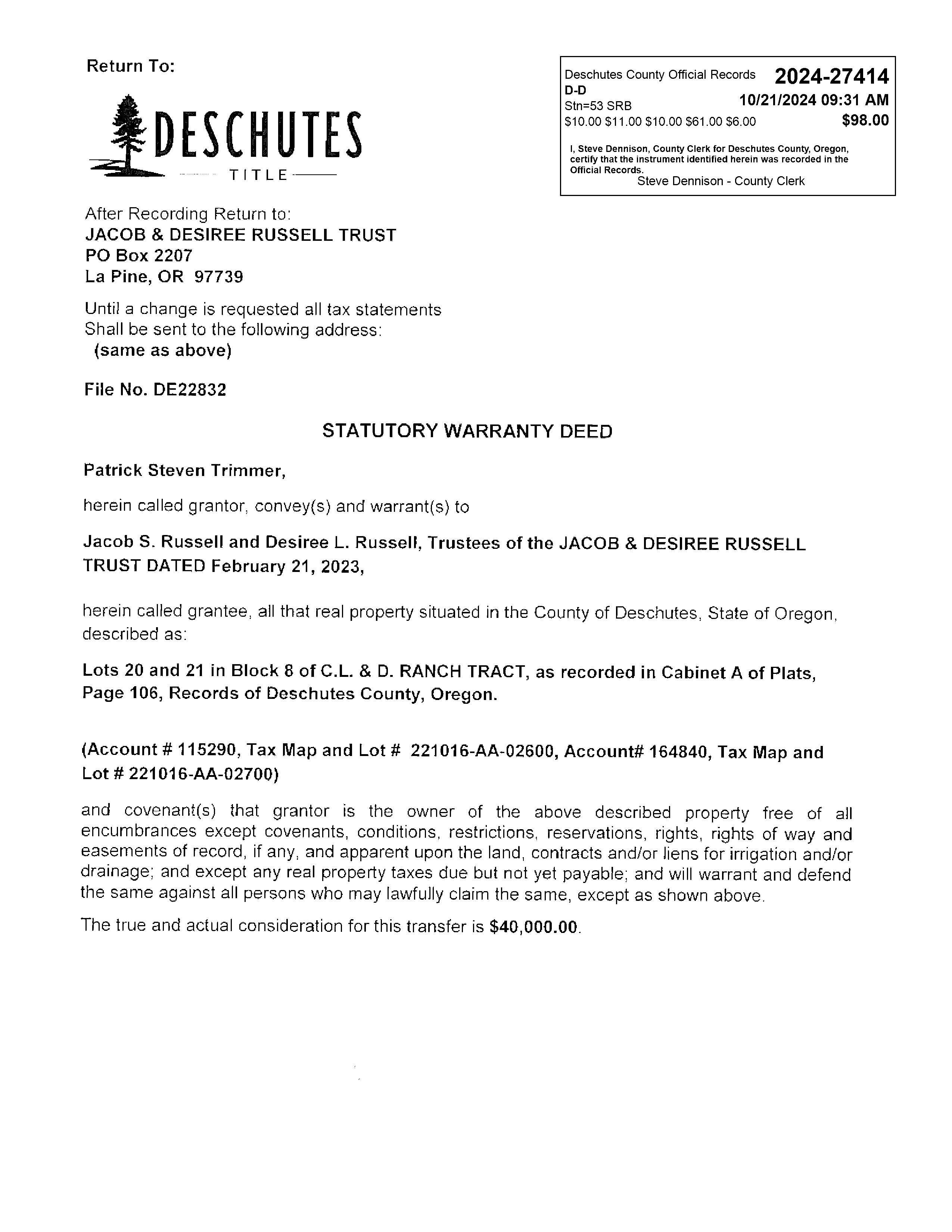 Deschutes Title and its affiliates make no express or implied warranty respecting the information presented and assumes no responsibility for errors or omissions.
