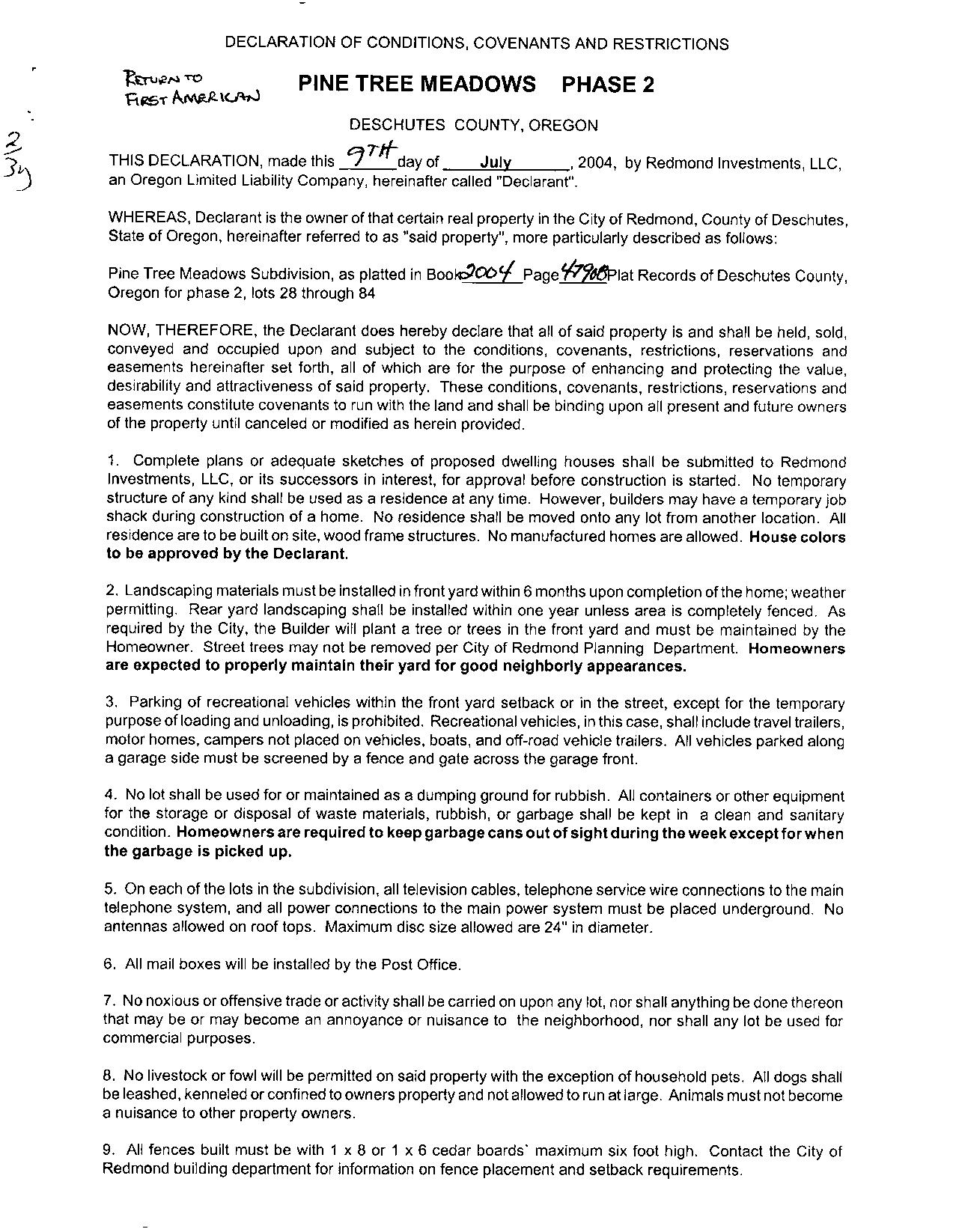 KNOW ALL MEN BY THESE PRESENTS, THAT I, RAY L. PAUL, MANAGING MEMBER OF REDMOND INVESTMENTS, LLC, AS OWNER OF THE LAND SHOWN OBJOINED PLAT, HAVE CAUSED SAID LAND TO BE SUBDIVIDED JOINED PLAT, HAVE CAUSED SAID LAND TO BE SUBDIVIDET INTO LOTS AND STREETS AS SHOWN ON SAID PLAT, AND DO HEREBY DED TRE POBLIC FOREVER ALL STREETS TO THE CITY OF REDMOND AS SHOWN ON SAID PLAT, AND DO HEREBY DEDICATE 5.00 FOOT WIDE PUBLIC UTILITY EASEMENTS AS SHOWN AND DO HEREBY DEDICATE A TEMPORARY FIRE TURNAROUND EASEMENT AS SHOWN, AND HEREBY ACCEPTING ALL EXISTINGEASEMENTS AS SHOWN, AND DO HEREBY SUBMIT FOR RECORD AND APPROVAL SAID PLAT OF "PINE TREE MEADOWS PHASE 2ND AP