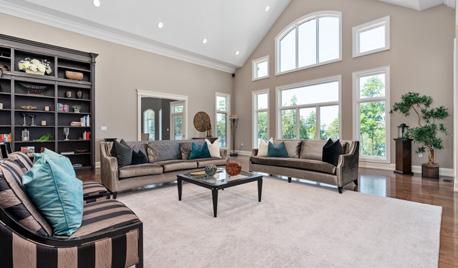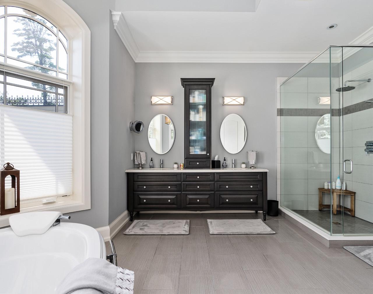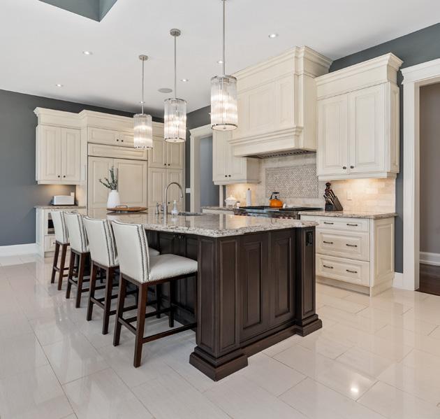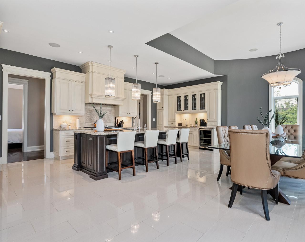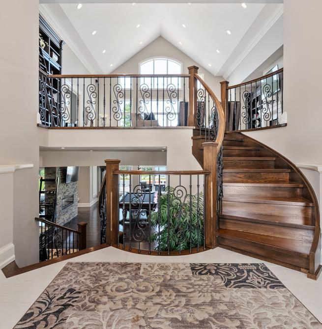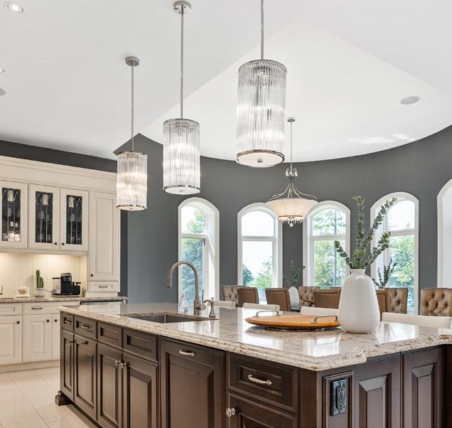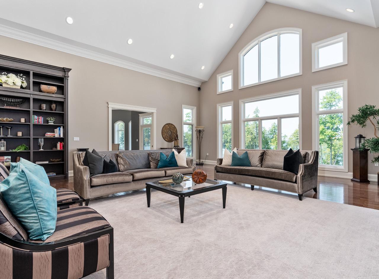 AT THE HEART OF THIS HOME LIES THE GREAT ROOM—A GRAND SPACE HIGHLIGHTED WITH 20FOOT VAULTED CEILINGS. THE ROOM IS ANCHORED BY A MAJESTIC GAS FIREPLACE, WITH INTRICATELY DESIGNED BUILTIN CABINETRY, A COMMANDING BOOKCASE COMPLETE WITH ITS OWN LADDER, AND A STUNNING WALL OF WINDOWS THAT OFFERS UNINTERRUPTED VIEWS OF THE LAKE AND MANICURED GROUNDS.