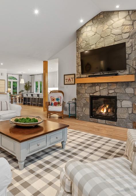 The custom kitchen is a chef’s dream, featuring sleek cabinetry, top-ofthe-line premium appliances, and a center island perfect for casual dining or serving up post-swim snacks. The adjacent dining area is framed by large windows offering beautiful views of the lake and gardens.