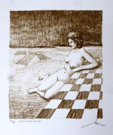 33 ARTISTA: Mauro Corradi TITOLO: L’attesa di Astrea, 2001 TECNICA: litografia DIMENSIONI: lastra 21 x 18 cm, foglio 35 x 25 cm COPIA: 51/60 BASE D’ASTA: 30,00 Euro