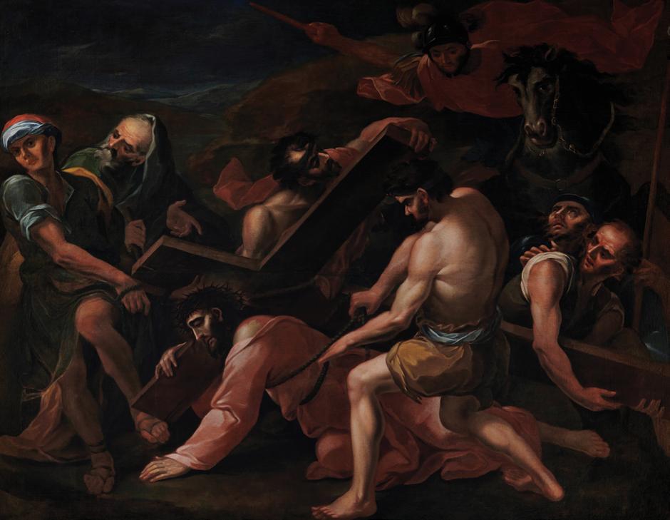The four episodes are represented following traditional motifs. However, due to the size and shape of the canvases, the theme of each painting takes up most of the space, with large figures and hardly any background details. Zahra takes advantage of this to create some stunning details in the facial expressions and body postures. The general tone of all the paintings, except the one depicting the agony in the garden, is that of violence; all the men surrounding Christ have bloodlust imprinted on their faces, be they mocking, beating, fastening ropes, pulling the broken man back on his feet to carry the cross, or even just watching. The only sign of compassion is found in two figures helping Christ carry the cross; these could be Simon of Cyrene and, judging from the military outfit, Longinus.38