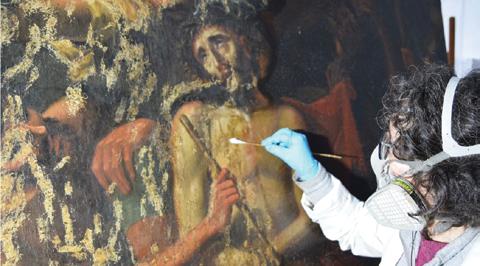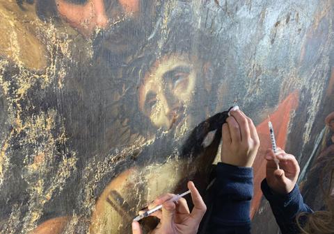 The painting of the Crowing of Christ with Thorns during conservation: the consolidation of the paint layer. (Courtesy of Atelier del Restauro)