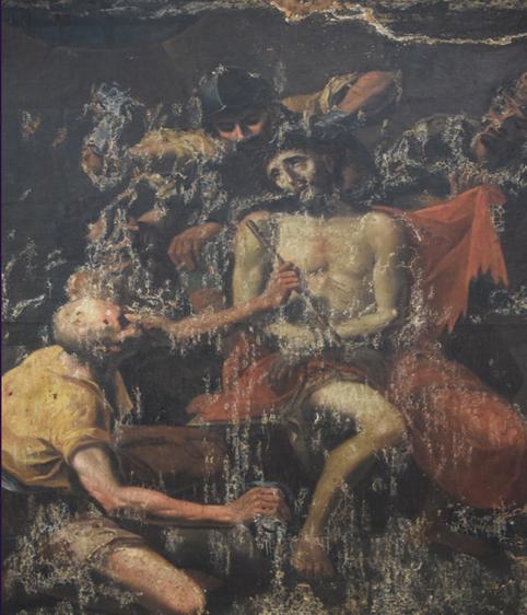 Finally, following the careful removal of old stucco and re-infilling and re-integrating the losses, the paintings were varnished using a satin finish, re-establishing the paintings’ legibility. Through this intervention not only were the original colours brought to light, for example the white drapery of the angel as well as the flesh tones, but several interesting background elements were also revealed, for example: the garden and the pathway in the painting depicting the agony in the garden, the cell with a window in the Ecce Homo, the candlestick and arches in the scene of the flagellation, and the mountains behind Christ in that depicting the fall under the cross. Following the removal of the overpainting, several important details were revealed, such as the original face of Simon of Cyrene in the painting showing Christ’s fall under the cross, and the mercenary with his tongue out, whipping Christ in an attitude of contempt, in the Ecce Homo. left column: Figs 7-8