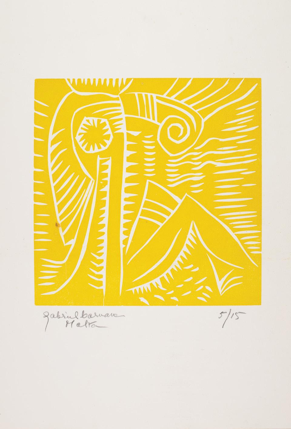 This print displays a combination of swirls and jagged lines creating decorative patterns. The lines on both sides of the print seem to be radiating from what could be a central Picasso-esque figure—it is possible to vaguely see a pair of legs in a seated position on what could potentially be blades of grass, and an arm and hand on the left. This is purely speculative, of course, though the border around the work certainly draws attention to the centre. The choice of yellow here gives the work a light, playful impression, barely contrasting with the white of the paper. Caruana’s love for colour, especially the bright colours observed in a sun-drenched Maltese landscape, becomes as important as the medium he worked with, in all of his art.