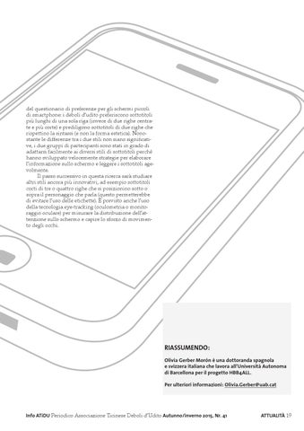 del questionario di preferenze per gli schermi piccoli di smartphone: i deboli d’udito preferiscono sottotitoli più lunghi di una sola riga (invece di due righe centrate e più corte) e prediligono sottotitoli di due righe che rispettino la sintassi (e non la forma estetica). Nonostante le differenze tra i due stili non siano significative, i due gruppi di partecipanti sono stati in grado di adattarsi facilmente ai diversi stili di sottotitoli perché hanno sviluppato velocemente strategie per elaborare l’informazione sullo schermo e leggere i sottotitoli agevolmente. Il passo successivo in questa ricerca sarà studiare altri stili ancora più innovativi, ad esempio sottotitoli corti di tre o quattro righe che si posizionino sotto o sopra il personaggio che parla (questo permetterebbe di evitare l’uso delle etichette). È previsto anche l’uso della tecnologia eye-tracking (oculometria o monitoraggio oculare) per misurare la distribuzione dell’attenzione sullo schermo e capire lo sforzo di movimento degli occhi.