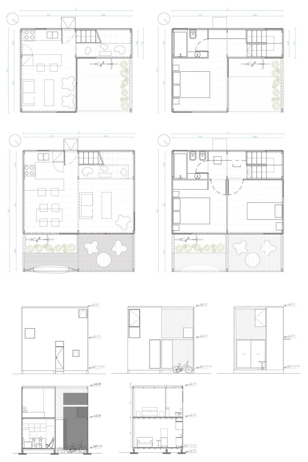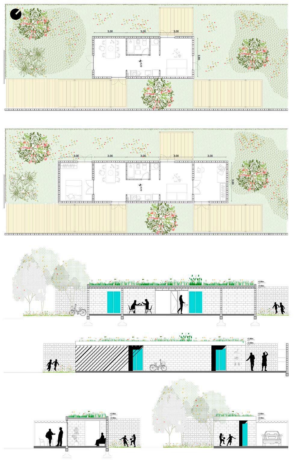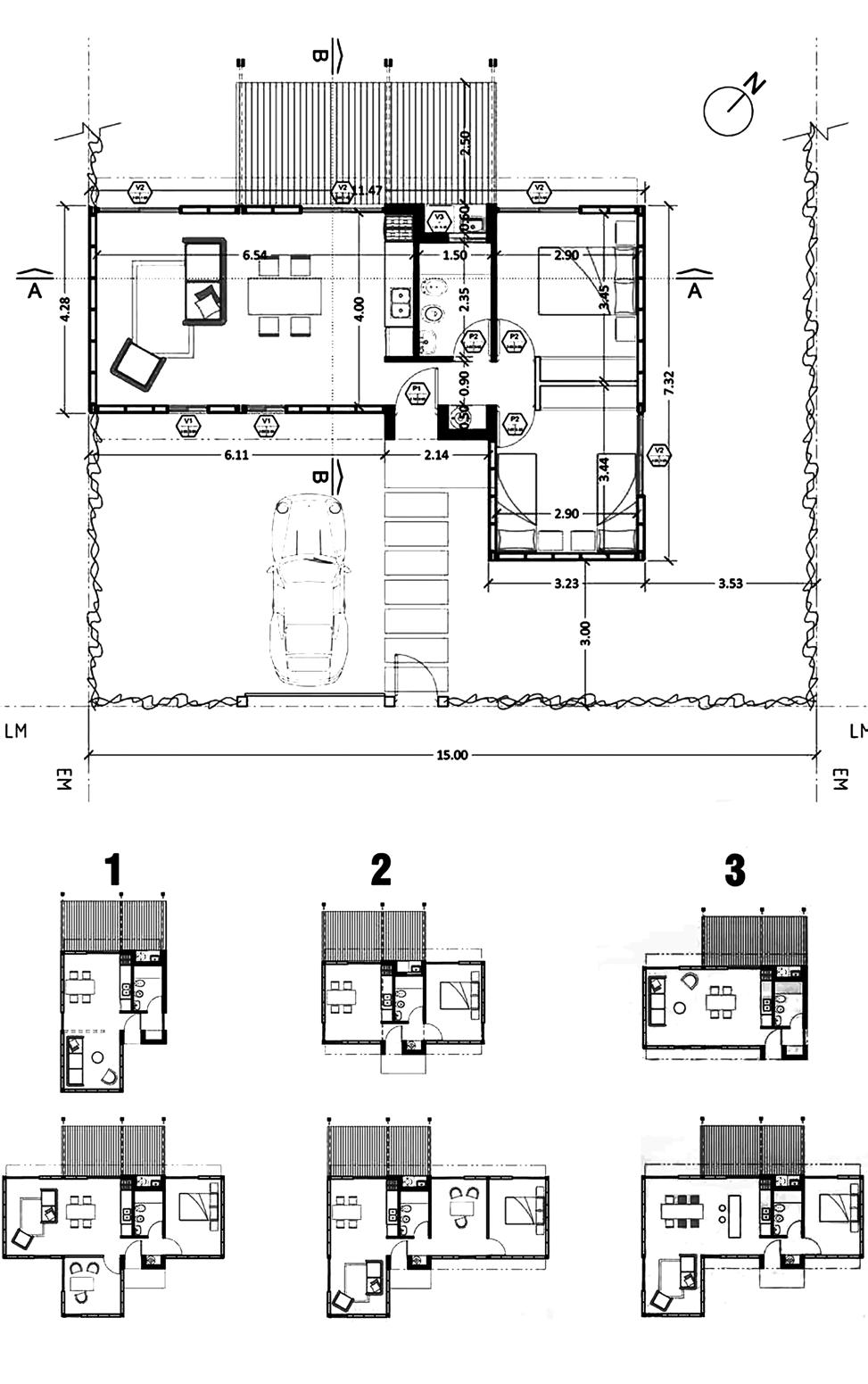 Teniendo como principal objetivo simplificar al máximo el diseño y la construcción para responder a las exigencias en cuanto a la superficie construida y a la organización de espacios que se adapten a los nuevos modos de habitar por su flexibilidad distributiva, nuestra propuesta plantea en la primera evolución de la vivienda dos volúmenes modulares iguales desfasados a los que, en una segunda evolución, se les suma un tercer volumen que propone dos variantes.