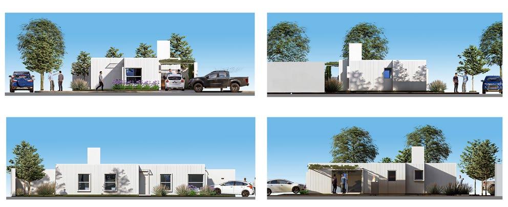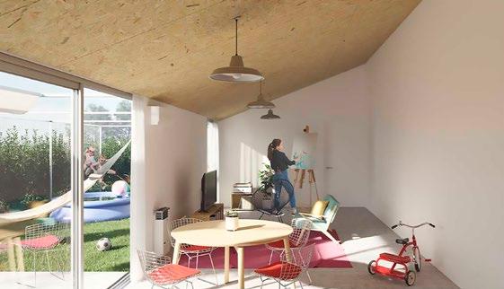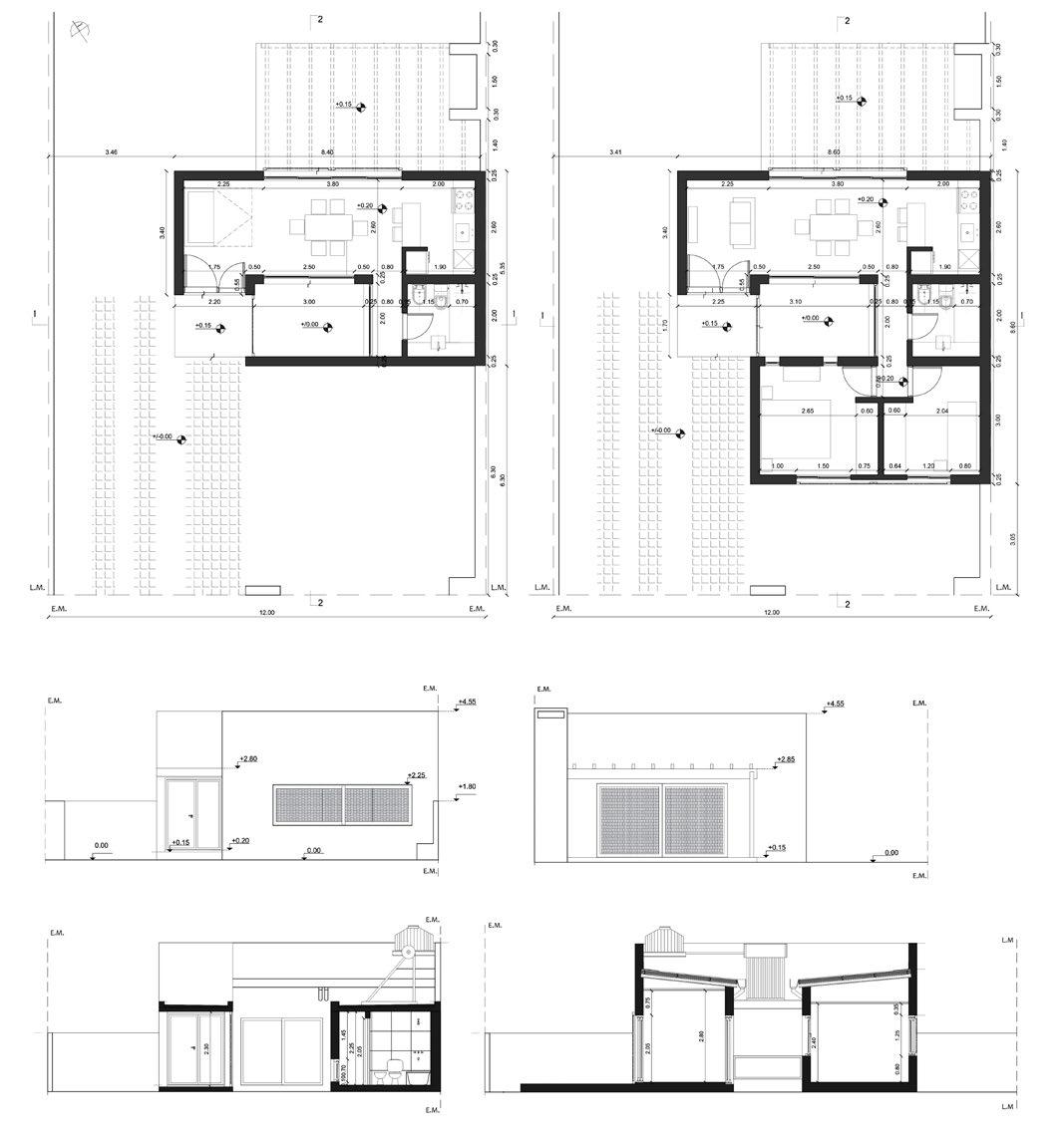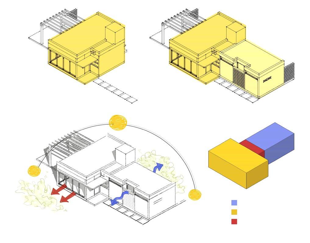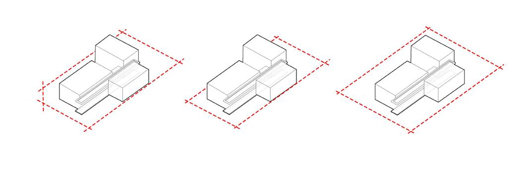Teniendo como principal objetivo simplificar al máximo el diseño y la construcción para responder a las exigencias en cuanto a la superficie construida y a la organización de espacios que se adapten a los nuevos modos de habitar por su flexibilidad distributiva, nuestra propuesta plantea en la primera evolución de la vivienda dos volúmenes modulares iguales desfasados a los que, en una segunda evolución, se les suma un tercer volumen que propone dos variantes.