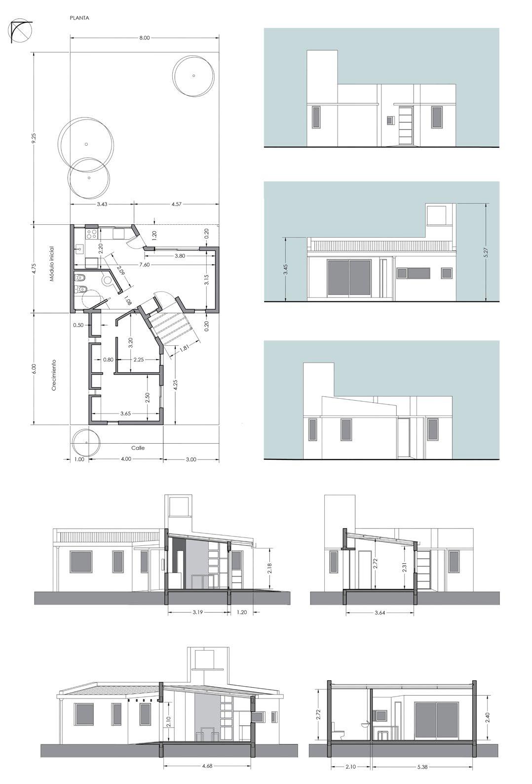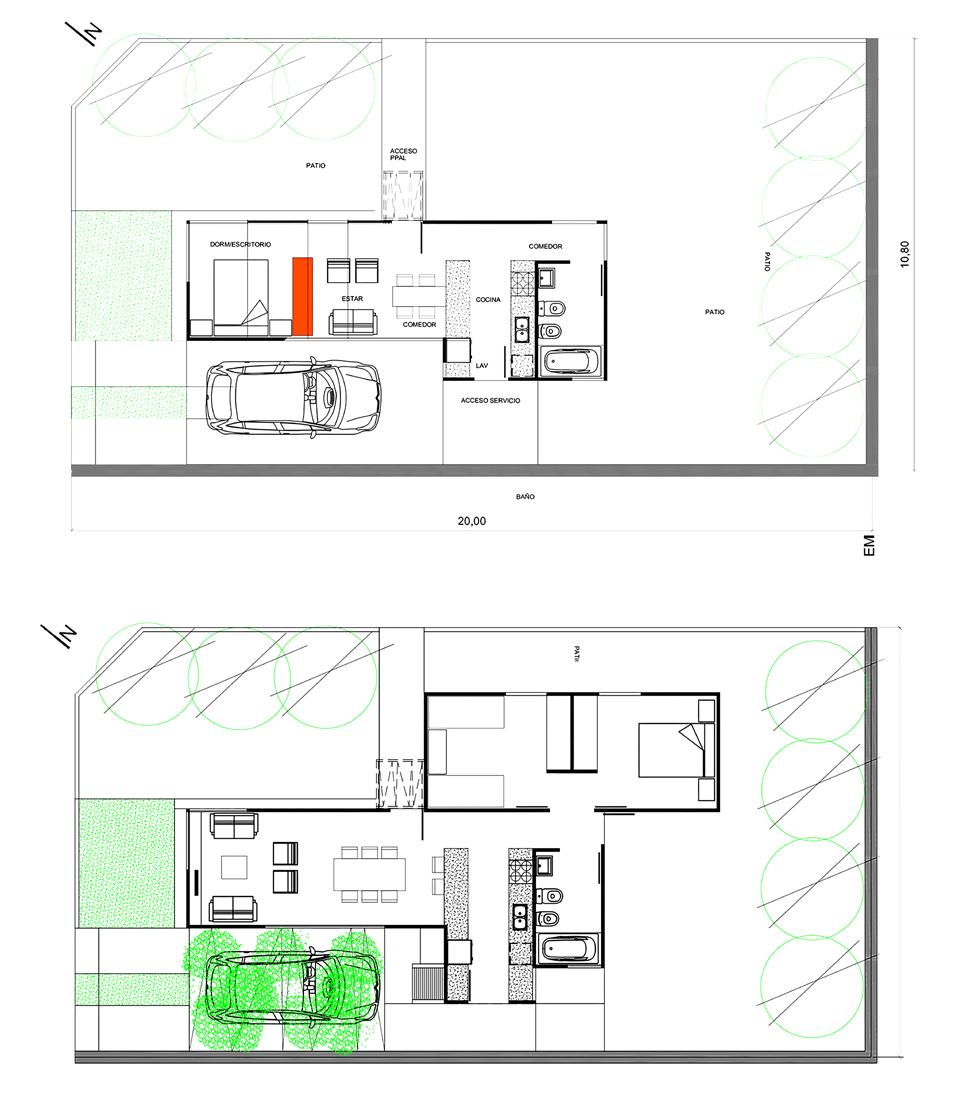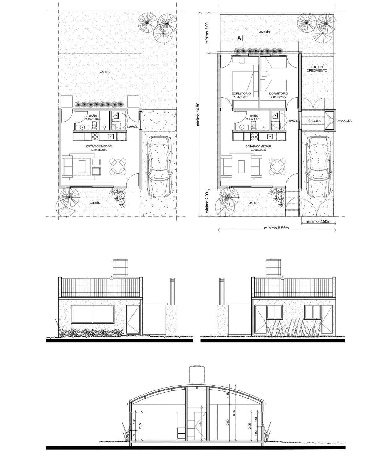 Vivienda pensada en principio para una o dos personas, en la primera etapa, y una segunda etapa con dos habitaciones (opcional sector de trabajo para realizar home office). Se propone el contacto con la naturaleza. Pensada para terrenos de 8 o 10 metros de ancho y 20 o más de fondo.