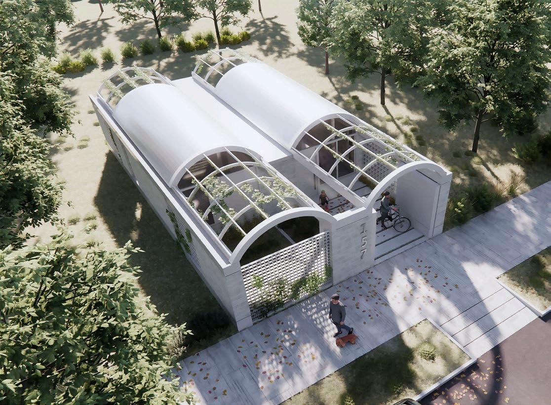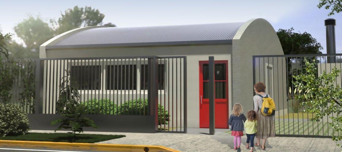 La cubierta de las bóvedas descansará longitudinalmente sobre muros portantes de bloques de hormigón con refuerzos verticales y horizontales según puntos críticos a considerar, mientras que los frentes se resolverán con tabiquería liviana para su fácil remoción y traslado en eventuales crecimientos futuros.