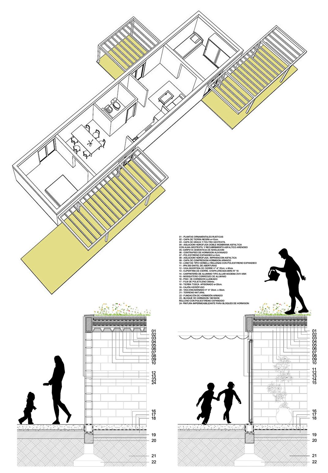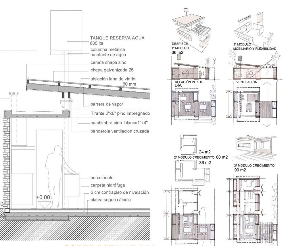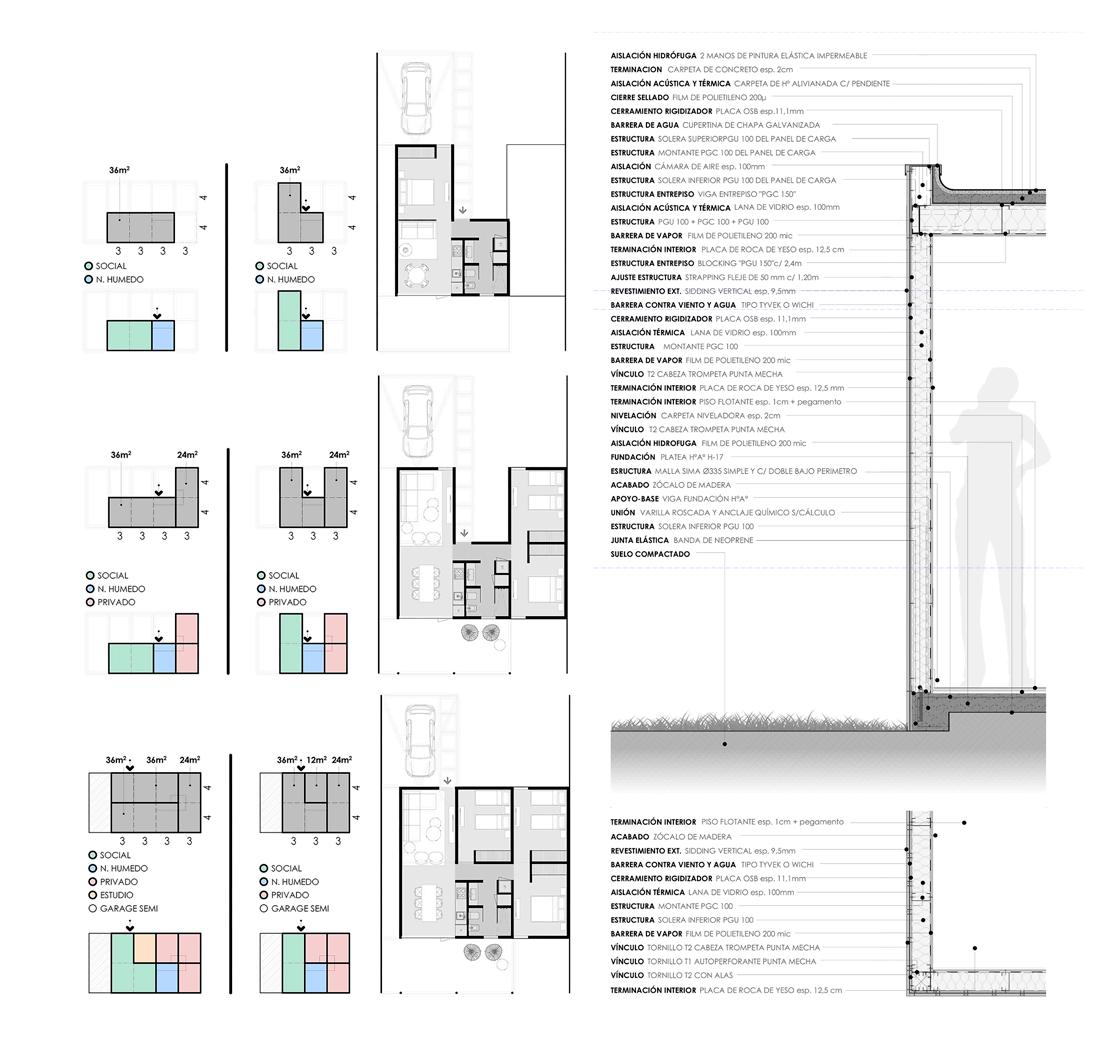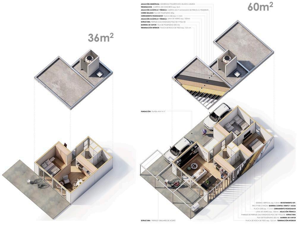 Los proyectos de vivienda debían proponer, según las bases, un módulo básico de 36 metros cuadrados, que evolucionara hacia otro de 60, con la inclusión de módulo sanitario baño-cocina, y espacios flexibles para actividades sociales, privadas y/o laborales. Se establecía, asimismo, que la documentación a presentar en el Concurso debía abarcar “la variable de una vivienda con perímetro libre o entre medianeras, con indicación del sistema de fundación adoptado (...), materialidad de la envolvente vertical (mampostería tradicional racionalizada o sistemas industrializados); también debe indicarse con precisión tipo de cubierta elegida con su correspondiente aislación y terminaciones internas”.