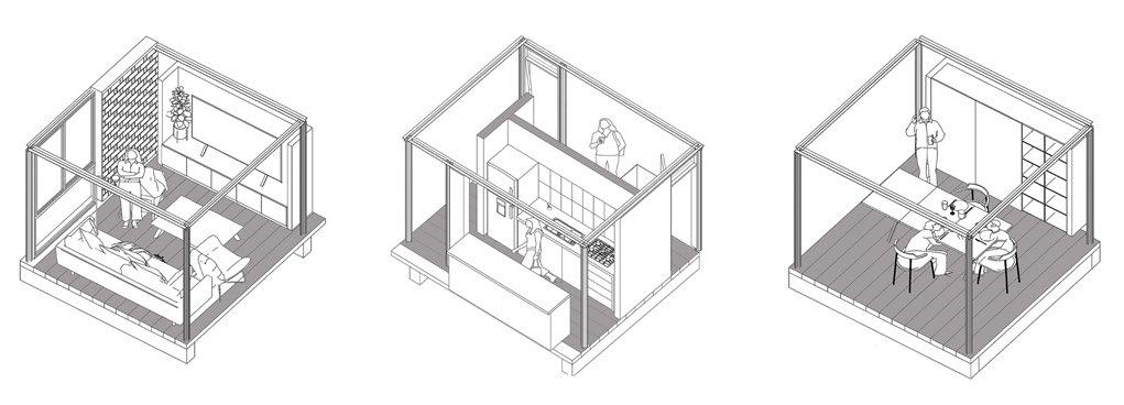 La estrategia de proyecto se basa en pensar un espacio único, condensador de actividades, en donde la premisa es optimizar la condición de usos diurno/nocturno en una superposición variada de rutinas, según las múltiples actividades de los integrantes del grupo de convivencia. De esta manera, a partir de un paralelepípedo inicial, se genera una grilla de modulación de 2,40x0,70x2,40 metros, a la que se le adosa un módulo de servicios, siendo éste el elemento “rígido” de la vivienda. En relación a esta grilla, se proponen