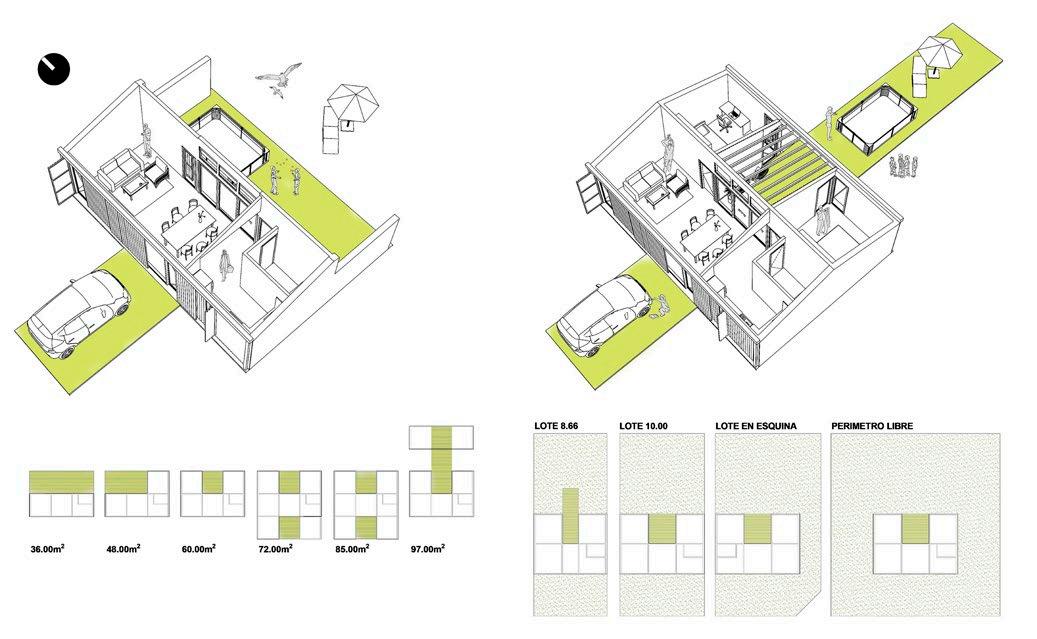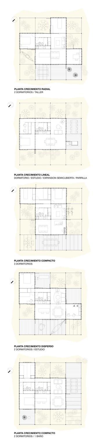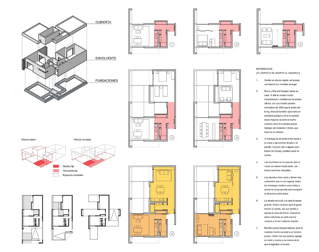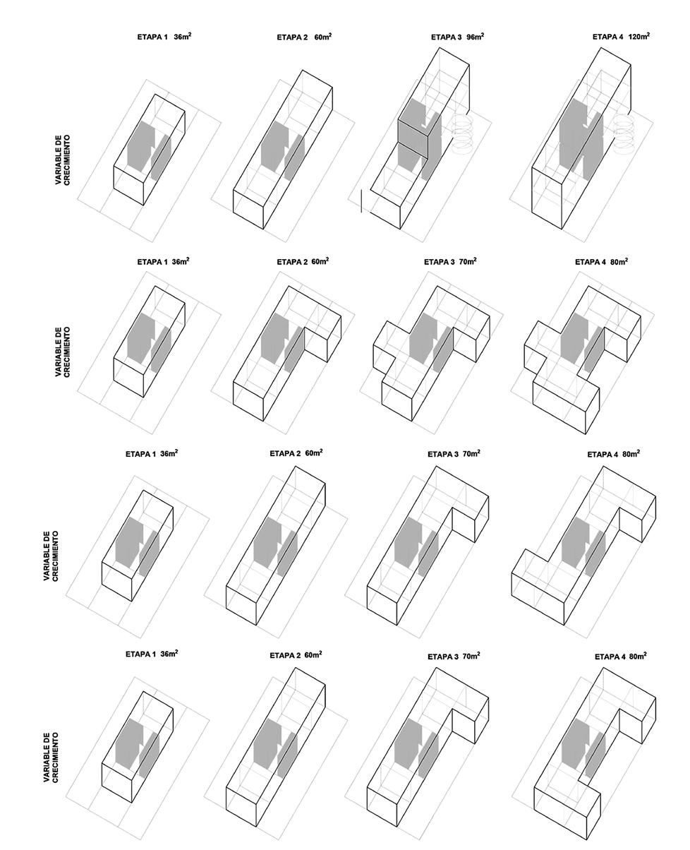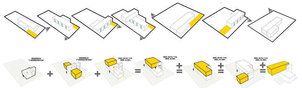 puestos, en donde toda la superficie es espacio de uso. La casa evoluciona con sus usuarios, gradualmente; se plantea un crecimiento modular reutilizando los elementos preexistentes.