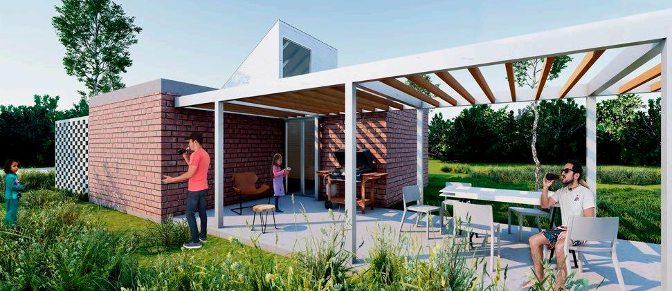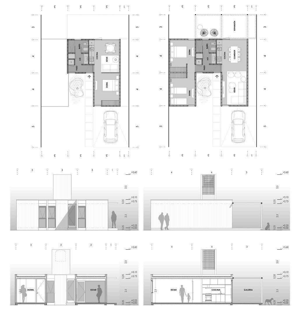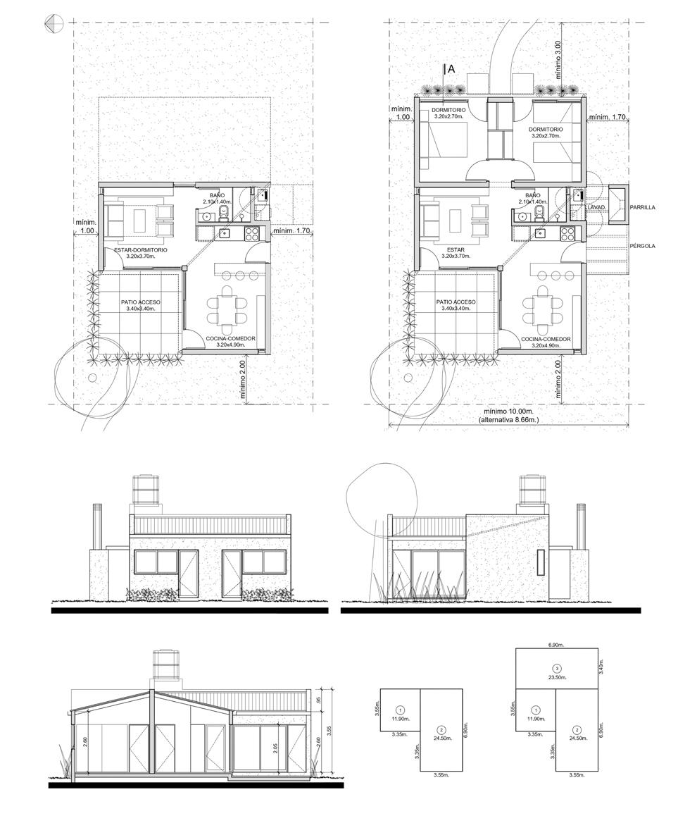 Una vivienda de 36 m2 (primera evolución) que se organiza en torno a un patio de acceso y una galería de expansión, definida por un solado, una pérgola y una parrilla, permitiendo recuperar desde el interior de la vivienda, por un lado, el patio del fondo, y por otro, el patio de acceso a la vivienda. Esta primera evolución posibilita disponer de tres módulos de usos organizados en torno al patio para comer, recrearse y descansar integrados, pudiendo maximizar la apropiación de los mismos según los criterios de uso que defina el potencial usuario. A partir de esta configuración espacial inicial, se prevé un primer crecimiento en planta baja hasta alcanzar una vivienda de 60 m2 (segunda evolución), conectando al sistema inicial un espacio habitable que incorpora dos módulos de usos con sus correspondientes módulos de soporte, destinado para actividades de descanso, estudio o trabajo, delimitando el espacio para la cochera y el acceso a la vivienda.
