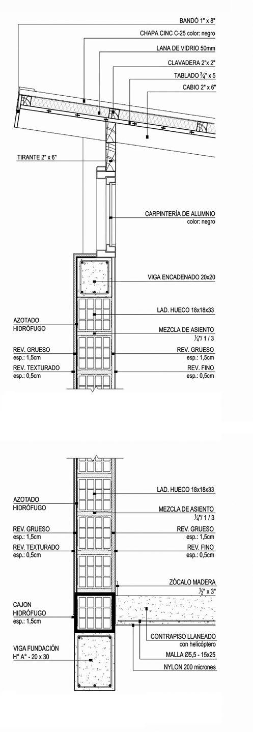 Fundaciones: vigas de encadenado de hormigón armado y pilotines. Mampostería: se construirá utilizando diferentes mampuestos, ladrillos cerámicos, bloques de hormigón, bloques volcánicos y ladrillón visto, respetando las normas IRAM en cuanto al coeficiente de tramitancia térmica.