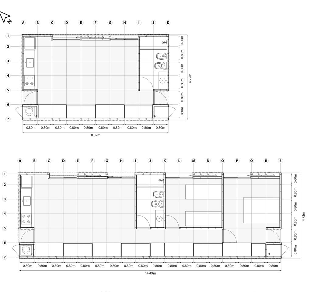La casa se organiza a partir de un esquema lineal con medidas mínimas, 4x9 metros (36m2) en su primera evolución y de 4x15 metros (60m2) en la segunda, configurando una matriz lineal con capacidad de adaptación a medidas de terrenos iguales o mayores a 8,50 metros de ancho (permitiendo un patio lateral de 4,50 de lado mínimo), e iguales o mayores a 20 metros de profundidad, tanto en su condición entre medianeras como en esquina, a partir de simples variaciones de inversión biaxial, desplazamiento y/o rotación, admitiendo un retiro de frente de 3 o 5 metros.