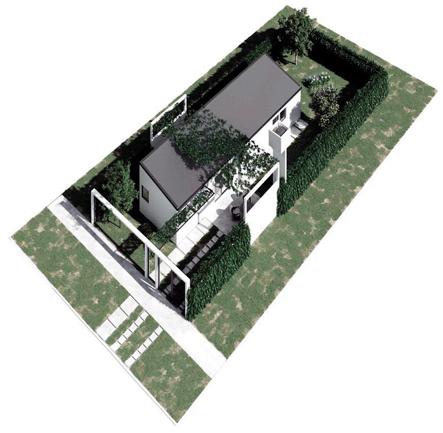 Se propone un prototipo de vivienda en lote 8x20 metros, para explorar las ventajas de trabajar con pliegues que amplíen la percepción del habitar a través de recorridos y visuales oblicuos, descontando que el mismo potenciará sus ventajas en locaciones más generosas.