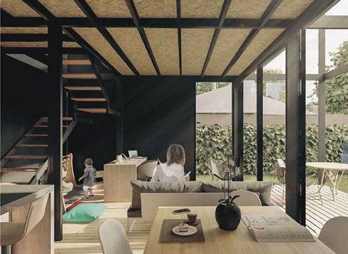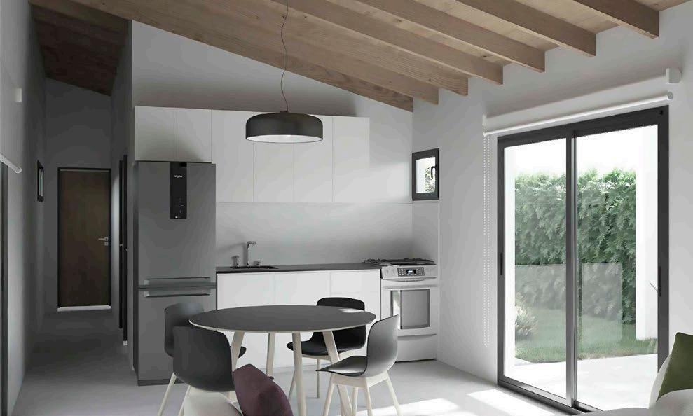 tada por el concurso- en planta alta, alcanzando una vivienda de 105 m2, a partir de incorporar un módulo soporte de escalera en el patio de acceso, conformando un hall de acceso en doble altura.