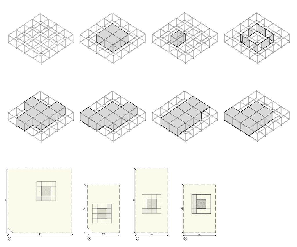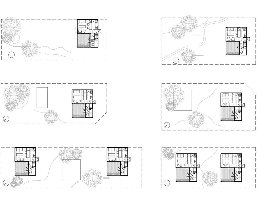 Cada módulo del cañón, con su naturaleza replicable en trama, hace posible pensar en organizaciones múltiples para prototipos de vivienda agrupada con gran variedad de alternativas volumétrico-espaciales. Es así que la casa cañón podrá ser interpretada desde su escala más básica y reducida hasta en una conformación agrupada en vivienda colectiva.