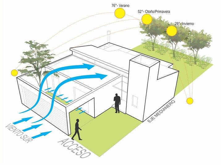 norte sobre el contrafrente. Dada la condición de asoleamiento, la vivienda buscará cerrarse hacia el frente (sur) y abrirse hacia el contrafrente (norte)