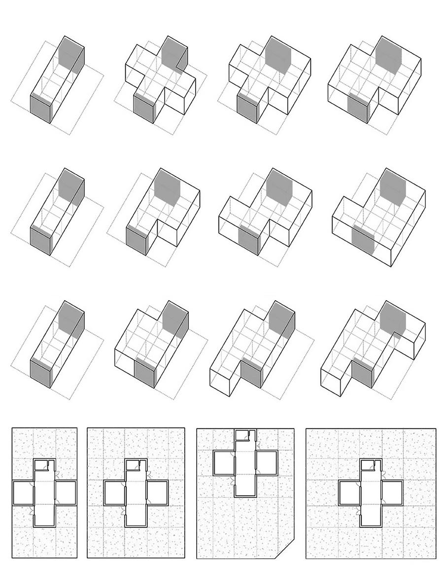La idea surge de la interacción de tres rectángulos (de relación de lado 2x1), que en su combinatoria generan la primera y segunda evolución de la propuesta. En la primera, es la yuxtaposición de dos de estos rectángulos que así dispuestos en su intersección generan un módulo sanitario (cocina/baño/lavadero), disponiendo así en sus extremos de sendos espacios sociales con un importante grado de flexibilidad (estar-comerdormir): con funcionamiento día-noche es simple generar un área para dormir. Esta solución abarca los primeros 36,00 m2 de la vivienda (primera evolución). Con la incorporación de la tercera figura rectangular aparece el área de dormitorios, completándose de este modo el esquema funcional de la casa (segunda evolución). Esta ocupa unos 24,00 m2 y dispone de dos dormitorios y su correspondiente