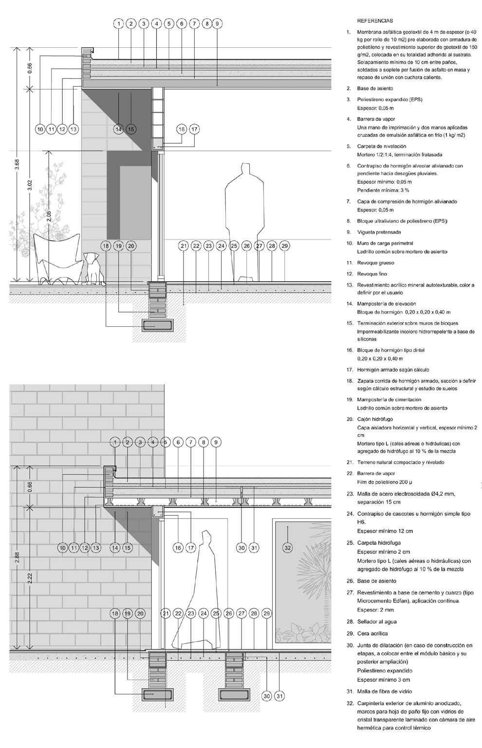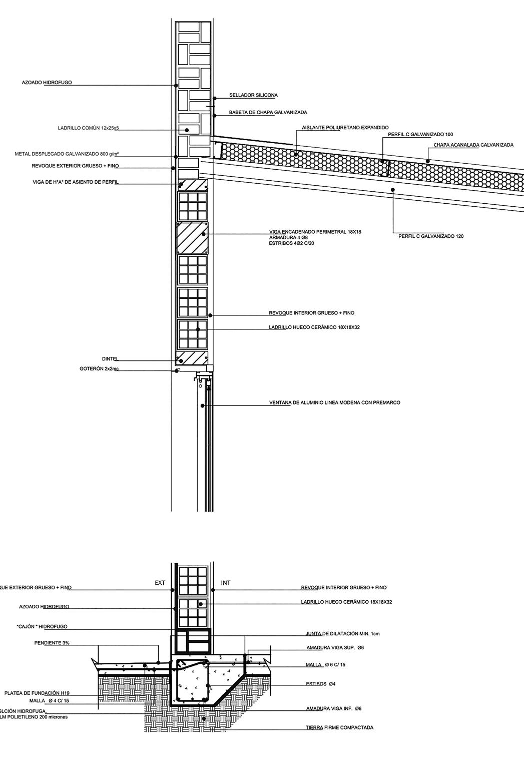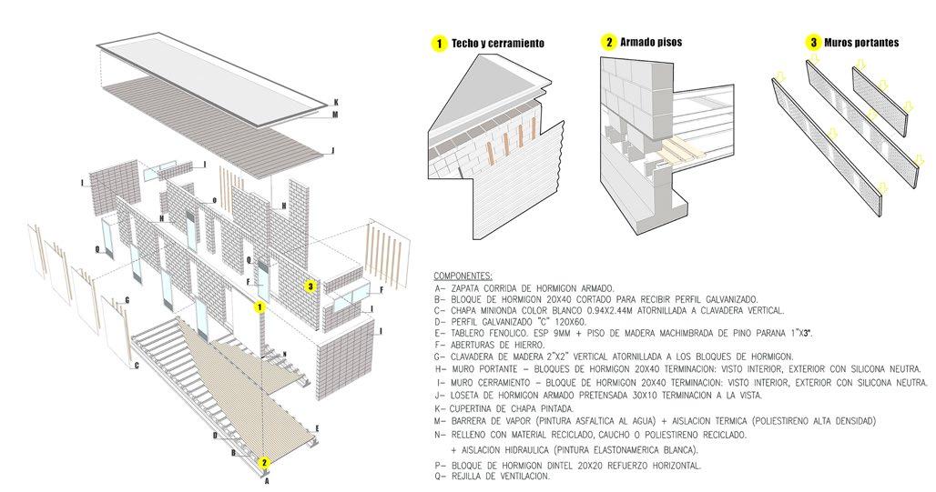 Las bases se conforman de pilotines y vigas de fundación. Muro portante de ladrillos cerámicos, con revestimiento texturado como terminación exterior y malla interior de fibra. Cubierta de chapa galvanizada aluminizada. Cielorraso de placa de yeso. Aislaciones en cerramiento lateral y superior.