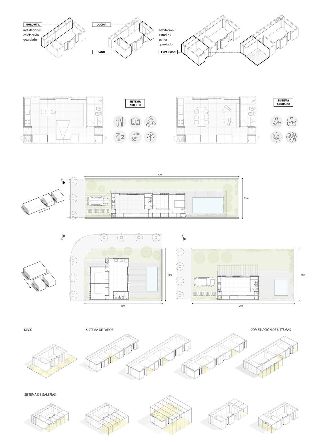 Cada sitio, como cada clima, cada suelo y cada familia, presentan características que combinadas hacen que cada vivienda sea única, que la forma de habitarla lo sea. Es por estas razones que no se propone un único modelo de vivienda sino un sistema, en el que cada familia, acompañada de un profesional, pueda armar la vivienda que más se adapte a su modo de vida. El sistema se conforma de un núcleo de servicios, módulo de circulación, módulos interiores y módulos exteriores. En primera instancia, la vivienda podría contar con el módulo de servicios y dos módulos interiores y luego crecer hasta completarse utilizando los cuatro módulos disponibles.
