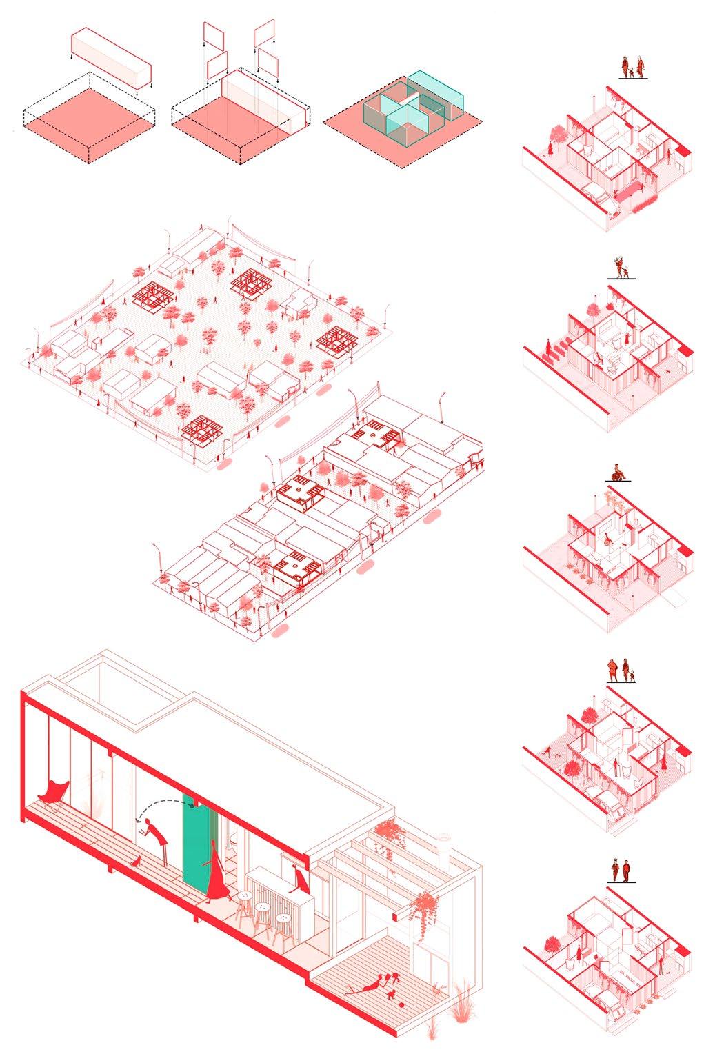 Entendemos la vivienda como un proceso progresivo y abierto, por lo que proponemos múltiples configuraciones a través de un sistema de adición: se plantea un crecimiento modular que posibilita diversos modos de habitar. Las potenciales