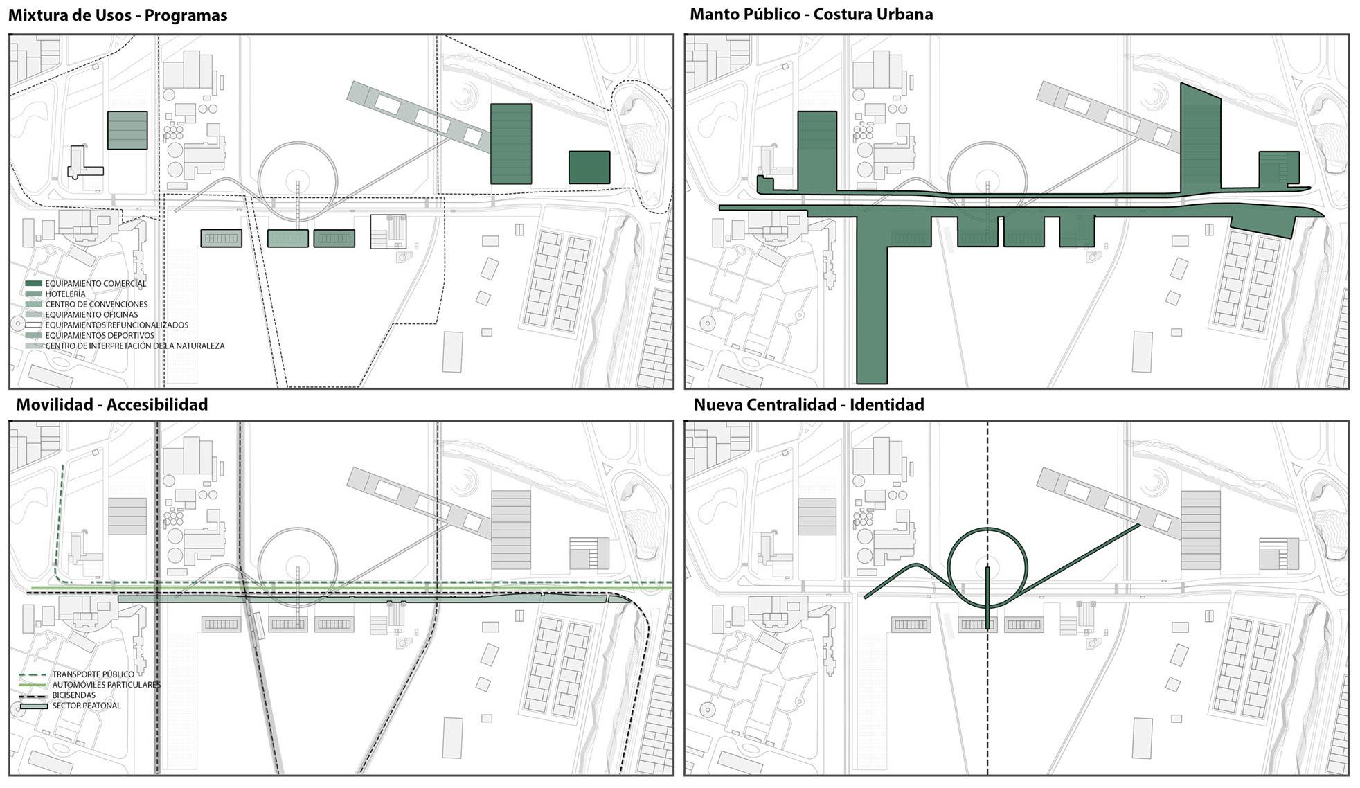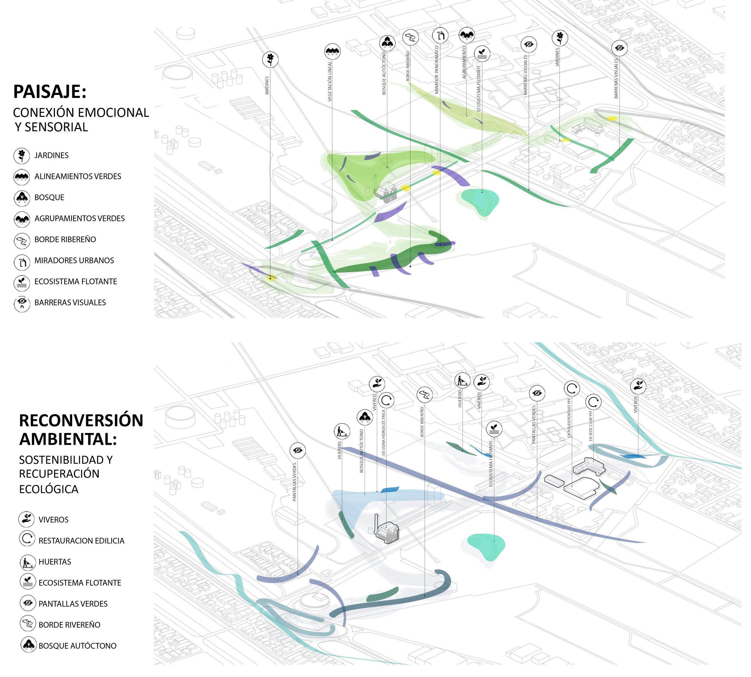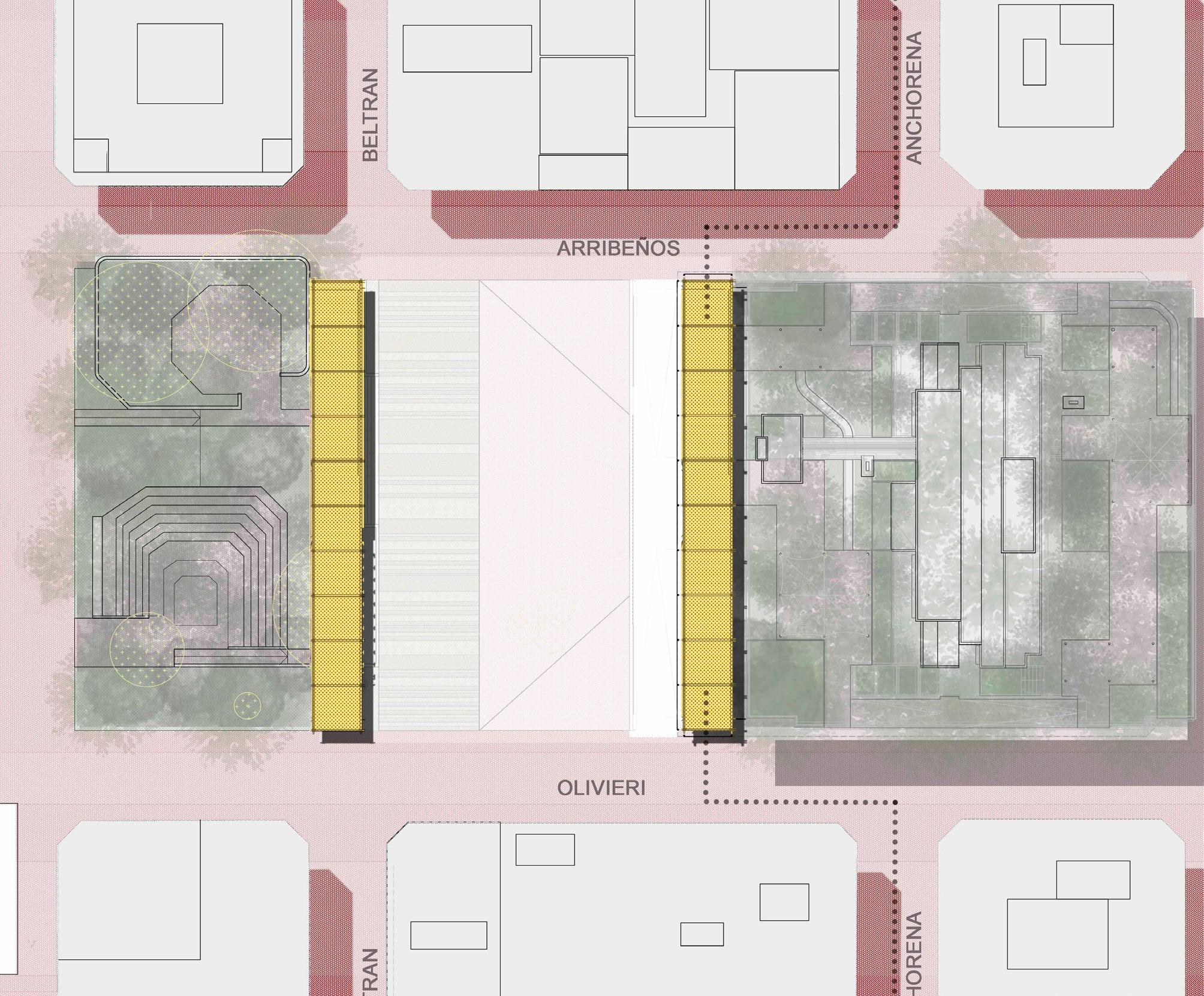 Partiendo de la interpretación del vacío y el eje de fragmentación funcional y espacial que genera la avenida Baradero, se organiza el conjunto de transformaciones espaciales del proyecto: La explanada o rambla pública a modo de espina central. Una grilla virtual que estructura la composición del vacío y los nuevos nodos. Los nodos programáticos que, mediante la expresión sintética y sistematizable de claustros, organizan la implantación para sincronizar paisaje agreste, visuales desde y hacia el río y las dinámicas de proximidad y complementa-