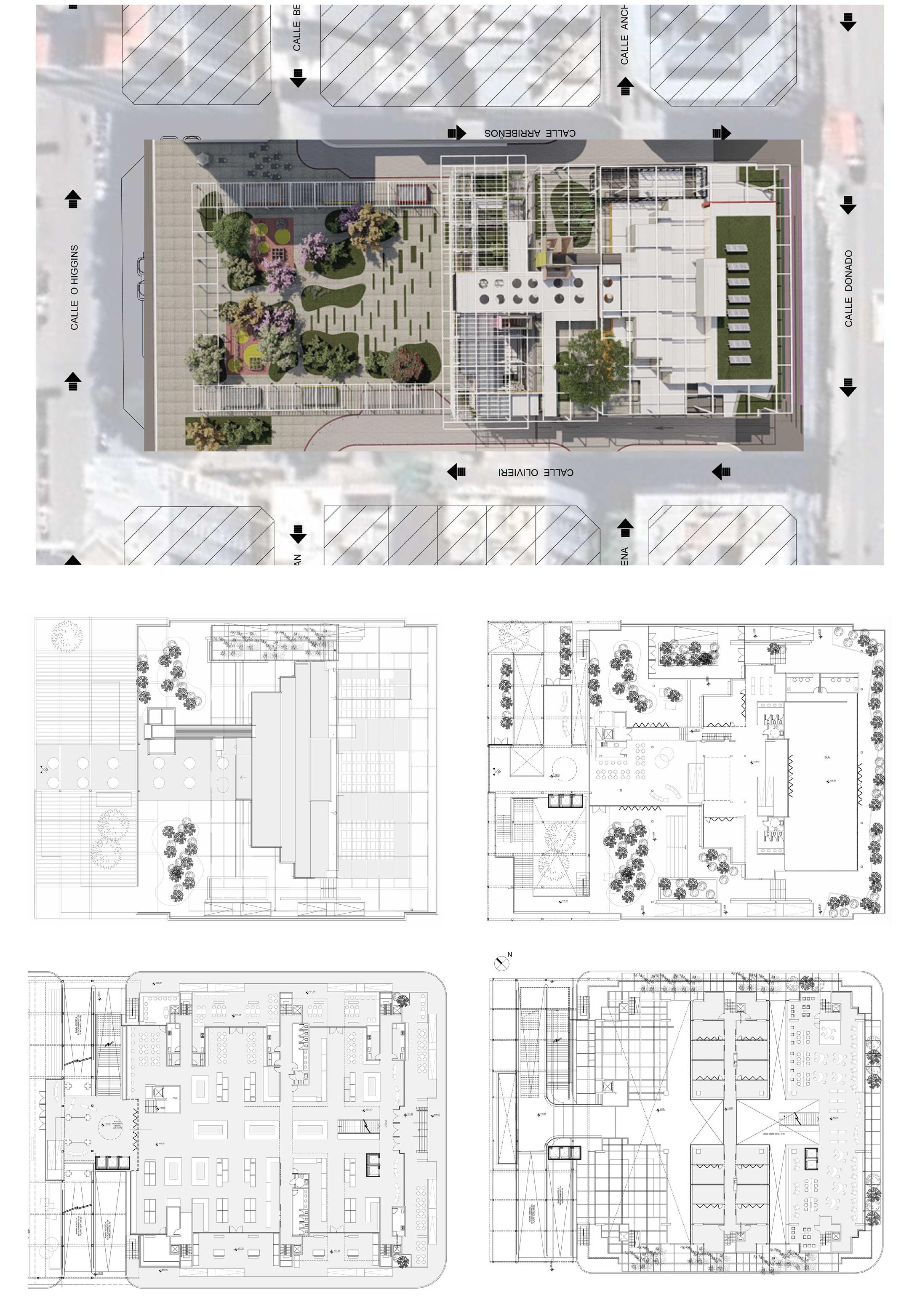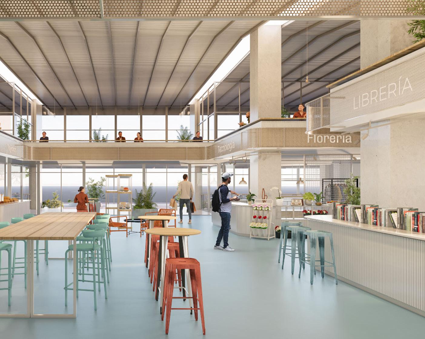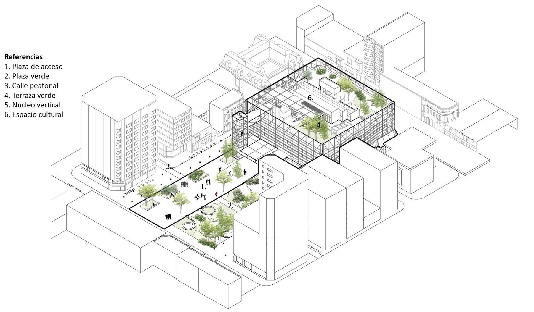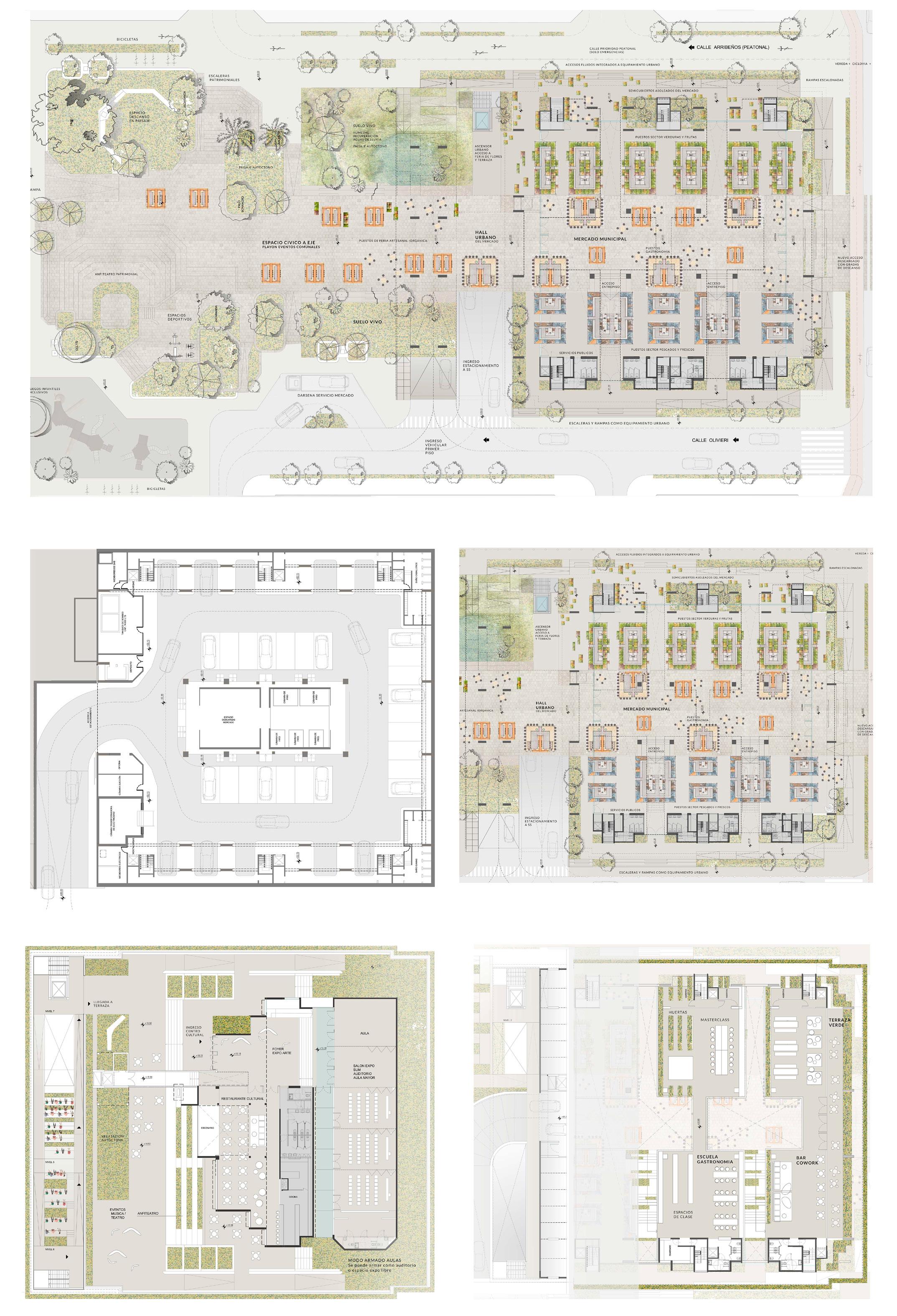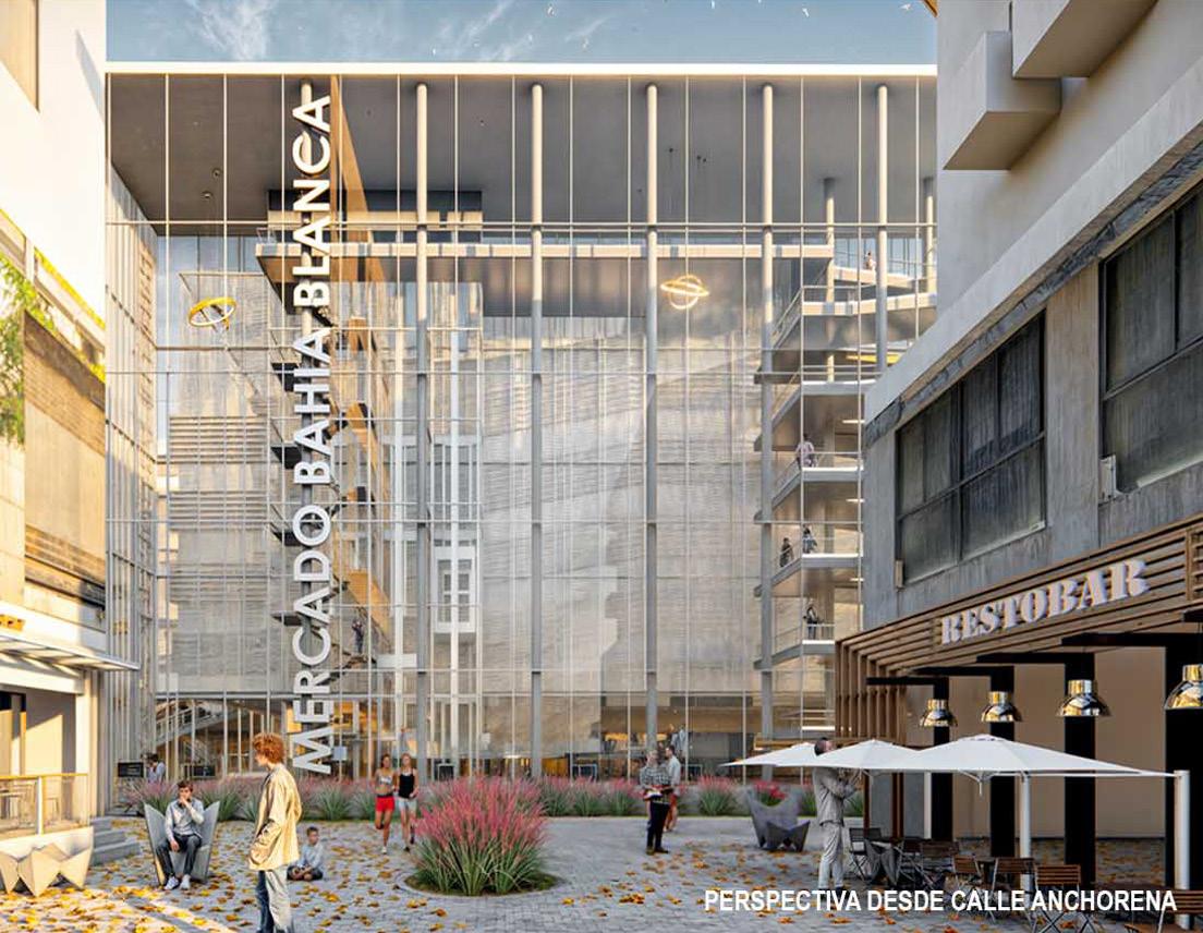 El centro del espacio de la planta baja es un mercado de piezas moduladas, integrables, que definen una estética renovada, contemporánea, de elementos livianos, de imagen continua y homogénea para dar unidad, y adaptándose a las múltiples actividades que se puedan dar. Con entrepisos despejados para espacios de gastronomía, lugares de trabajo tipo cowork, o puestos de venta que requieras espacios expositivos. Servicios. Los servicios se ubican ordenadamente en un perímetro para liberar el espacio central de un mercado flexible, pero se intercalan como llenos y vacíos para despejar los bordes y asi tener accesos libres desde la ciudad en todas las caras. Hall cultural. Se propone un nuevo Hall cultural, accesible desde la Plaza y el nuevo pasaje propuesto y desde el espacio peatonal urbano, siendo un espacio de llegada con exposiciones como antesala del gran remate cultural. Núcleo. El nuevo núcleo emerge como un hito que se eleva como un tótem de cara a la Plaza. Otorga un valor simbólico de renovación y de cartel de escala regional, que conecta la vida urbana del cero con el remate de esta pieza urbana, como es el faro cultural. Asociado al nuevo Hall, tiene su acceso desde ese único punto, reforzando la idea de espacio de llegada. Centro cultural y Terraza mirador. Pensando en la idea de acupuntura, introducimos una nueva pieza que articula las partes en las preexistencias, potenciando las conexiones y el uso de la terraza como un recorrido cultural, que tiene exposiciones en todos los espacios reciclados para tal fin. Con diseños contemporáneos, brindan la posibilidad de generar actividades contemplativas como participativas, con salas, salones multiuso, bar y expansiones como patios de esculturas, convirtiéndose en el gran