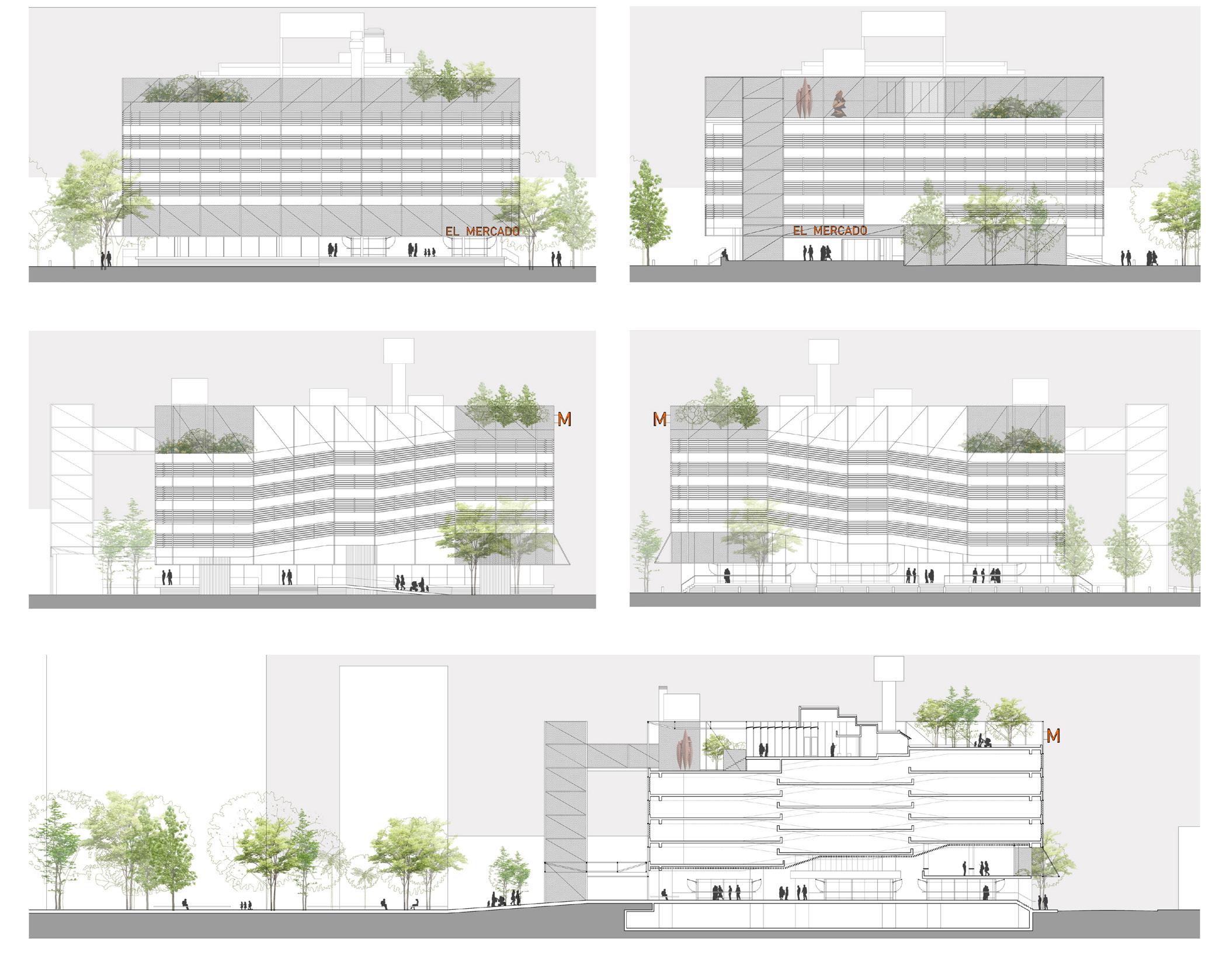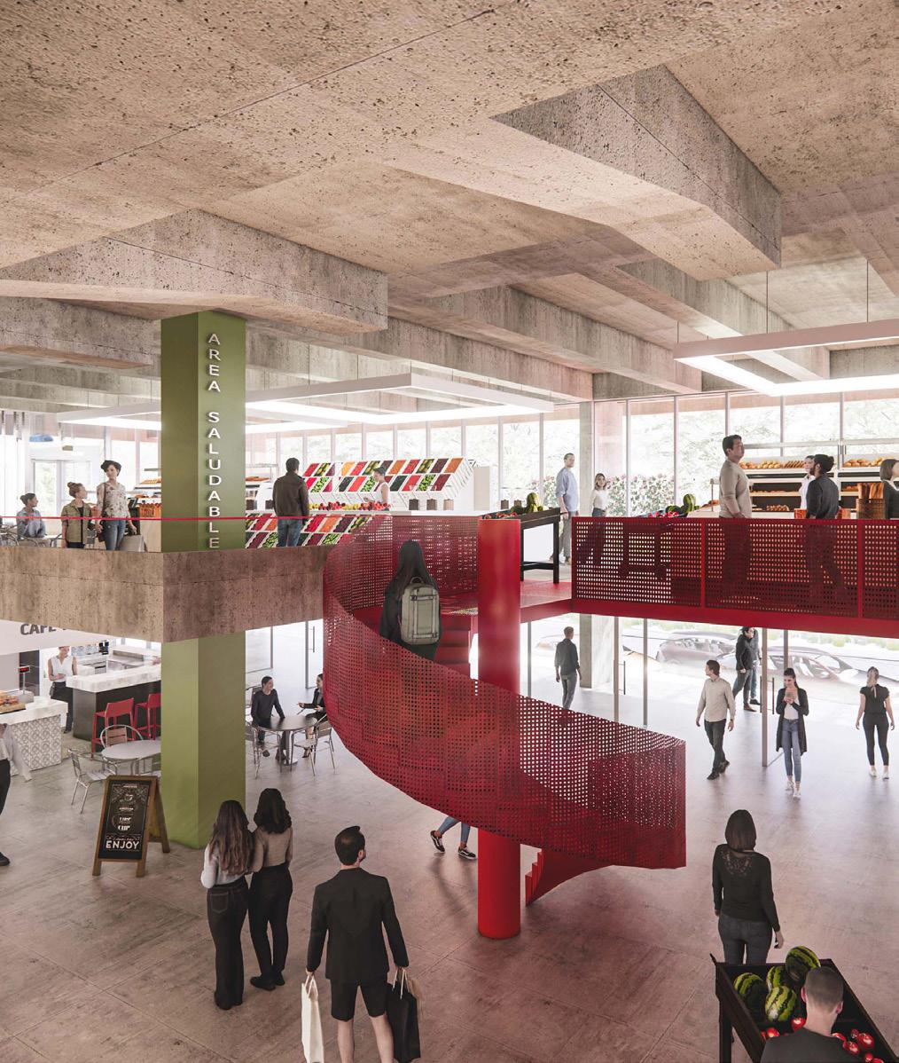 Mercado. En términos específicos para cada parte del programa, se propone una planta baja permeable, que tenga accesos en los cuatro lados, y un perímetro ligado a lo gastronómico para generar desborde en la vía pública, dándole vida a las calles semipeatonales.