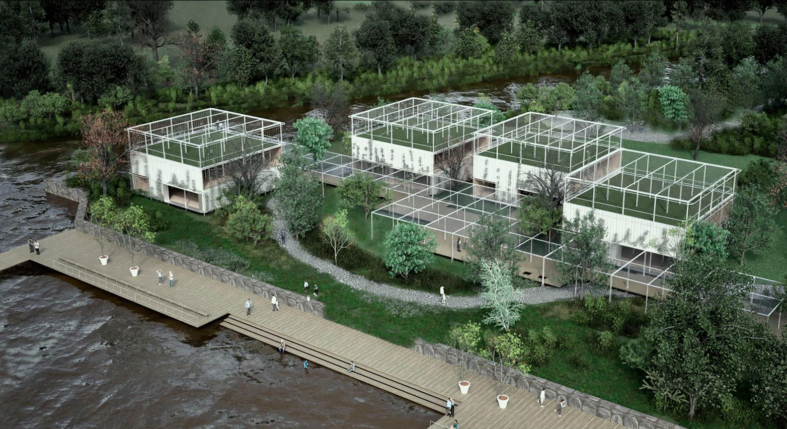 La escala de la intervención debe ser consecuente con el paisaje y con el contexto inmediato. La matriz como modelo geométrico abstracto ofrece la flexibilidad, articulación e integración necesarias. La incorporación de las partes y el todo en un sistema continuo y permeable. Un espacio de estructura clara, de bajo impacto en el entorno natural, así como una serie de espacios accesibles y de escala humana. La estrategia del proyecto responde a un rigor geométrico que, a través de operaciones tridimensionales sencillas, facilite que los sistemas espaciales se integren al sitio, articulando, en un todo, las diversas demandas programáticas y favoreciendo las vistas al rio.